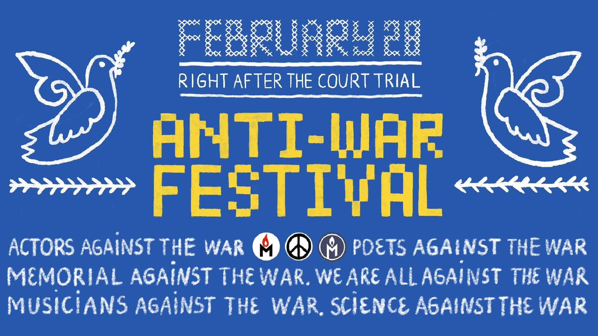 Этот плакат мы тоже показали на берлинской выставке. Он очень важен для меня. 28 февраля 2022 года был последний суд над "Международным Мемориалом", и в этот же день мы провели в "Мемориале" антивоенный фестиваль – первый и, наверное, единственный открытый в Москве. Он проходил в здании "Мемориала" на Большом Каретном, которое потом отобрали. Туда 28 февраля пришли все скорбящие: коллеги, музыканты, художники, все-все. Тогда уже начались аресты за выход на митинги, кто-то вообще не смог дойти, потому что уже сидел 15 суток в ОВД.