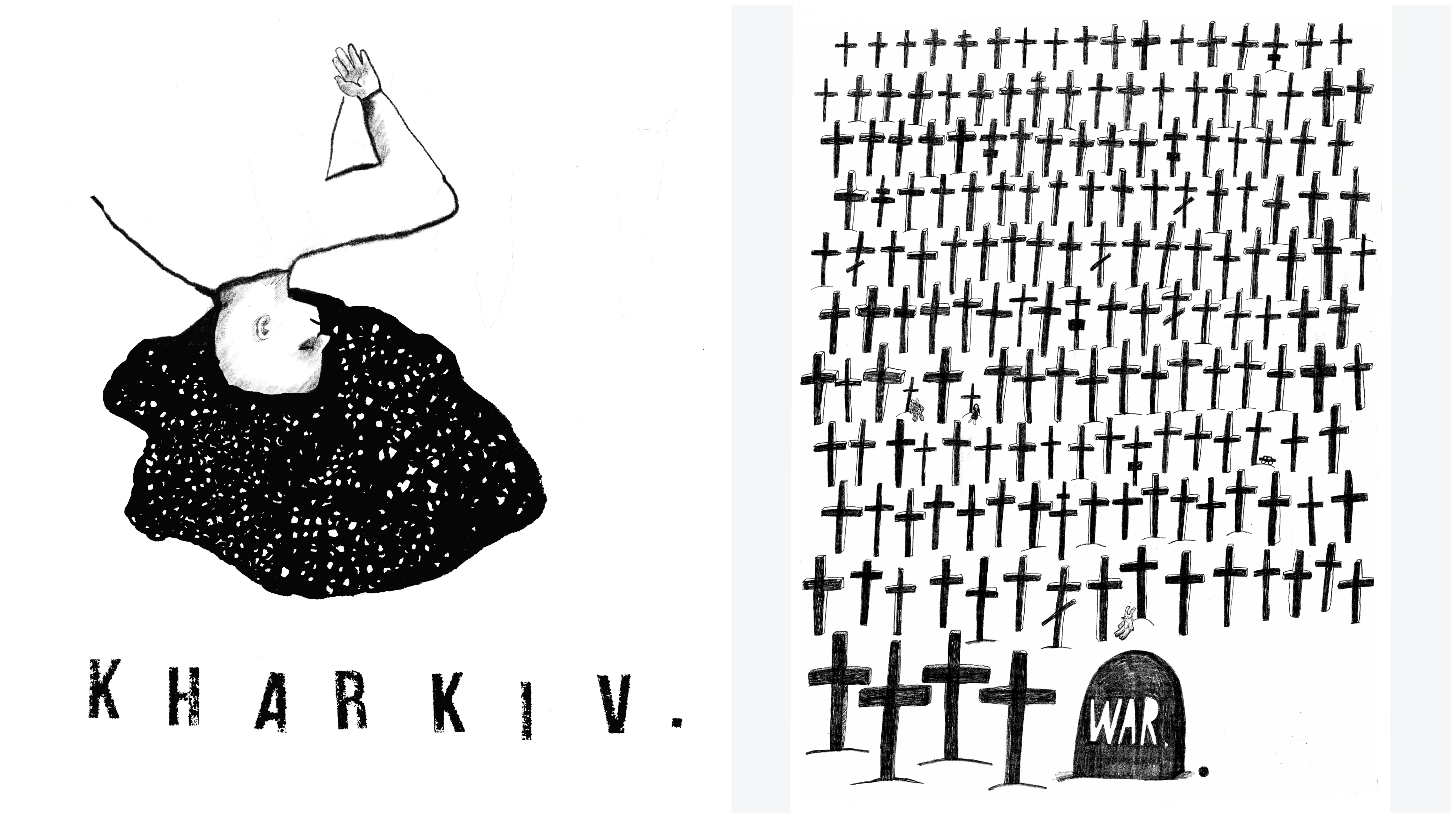 На моём сайте представлены мои довоенные работы (честно, нет времени добавить туда сделанное за последние два года!). Если сравнить их с сегодняшними, очень хорошо виден контраст в настроении: как я рисовала до и как рисую после. Всё ушло в монохром, в основном всё чёрно-белое. Я не делю всё на чёрное и белое, но мир изменился, как-то поблек. Просто я как рисовальный репортажник использую минимальные средства. Иногда меня просят, чтобы я не использовала так много чёрного. Я не могу. Как чуешь, так и рисуешь.