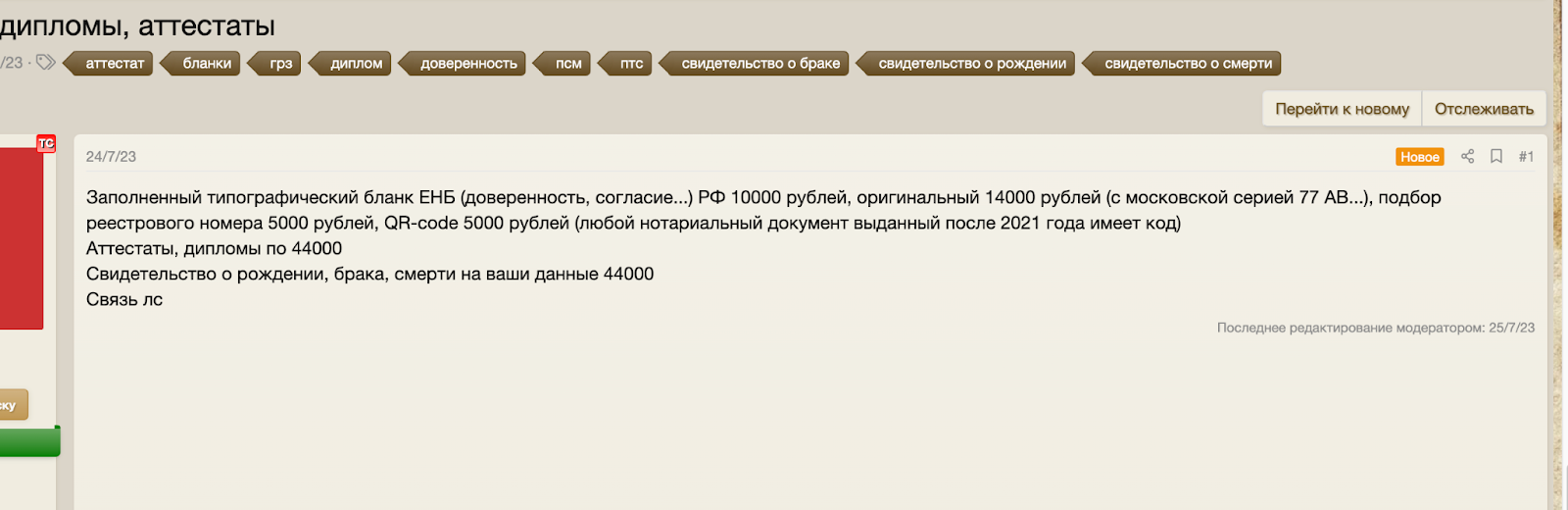 Услуга отрисовки предлагается в даркнете в таком же будничном режиме, как и любые другие. Обычно она стоит от 5 до 15 тысяч рублей. Иногда услуга подбора существующего номера доверенности и QR-кода предлагается отдельно. Чем больше положительных отзывов об «отрисовщике», тем выше и цена на услуги. Подлинность отзывов проверяет администратор площадки, на которой предлагается услуга.