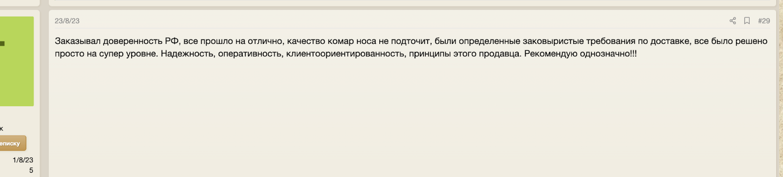 Скриншоты с примером предложения и отзыва на услугу отрисовки поддельной доверенности в даркнете