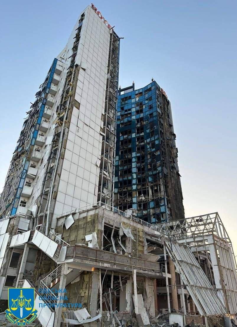 Во время ночной атаки по Одессе повреждения получили здание администрации морского вокзала, расположенный рядом неработающий отель «Одесса» и зернохранилища. Украинские СМИ публикуют фотографии отеля, сделанные до и после атаки.