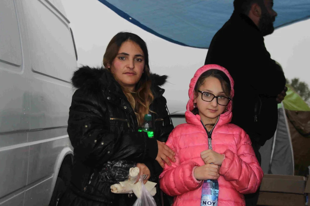 В шатрах тесно, здесь кипит работа. Мужчины звонят отцам, братьям и друзьям, а женщины кутают продрогших детей в пледы. На улице льет дождь, и те, кто еще не успел уехать, стоят под тентом.