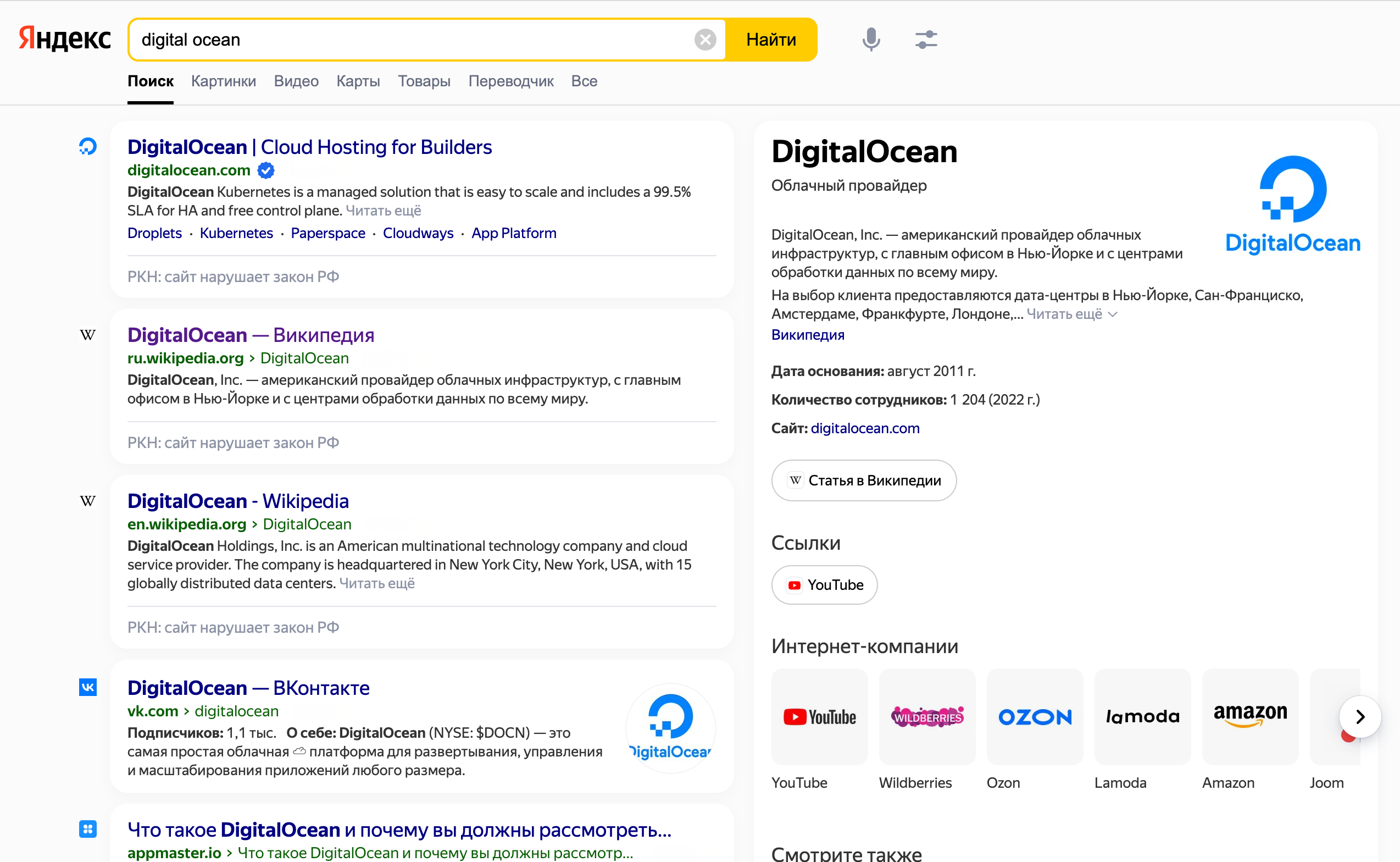 В выдаче «Яндекса» под карточками сайтов, которые Роскомнадзор выделил среди хостингов, не исполнивших требования закона о «приземлении», появилась пометка «РКН: сайт нарушает закон РФ». Внимание на это обратил депутат Госдумы Антон Горелкин.