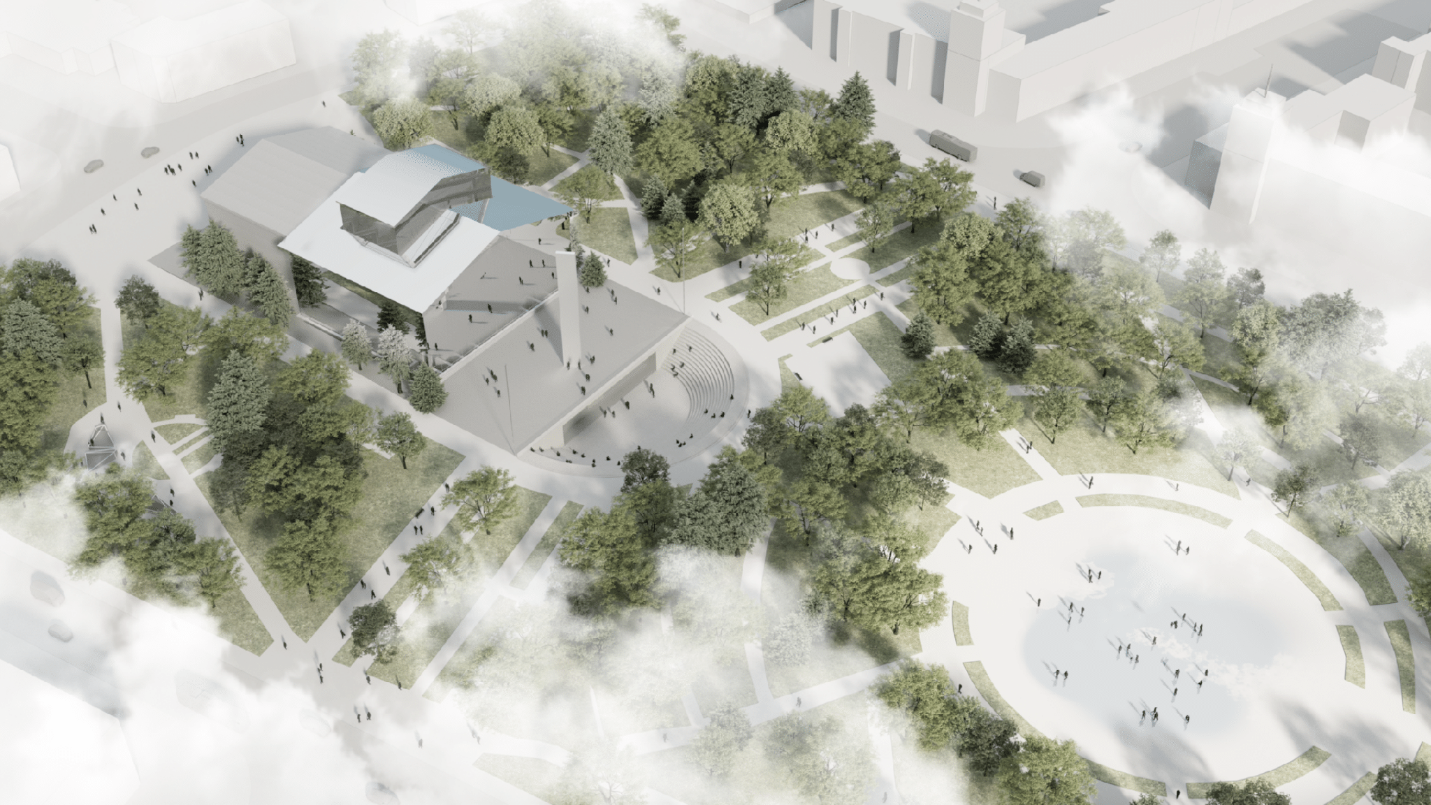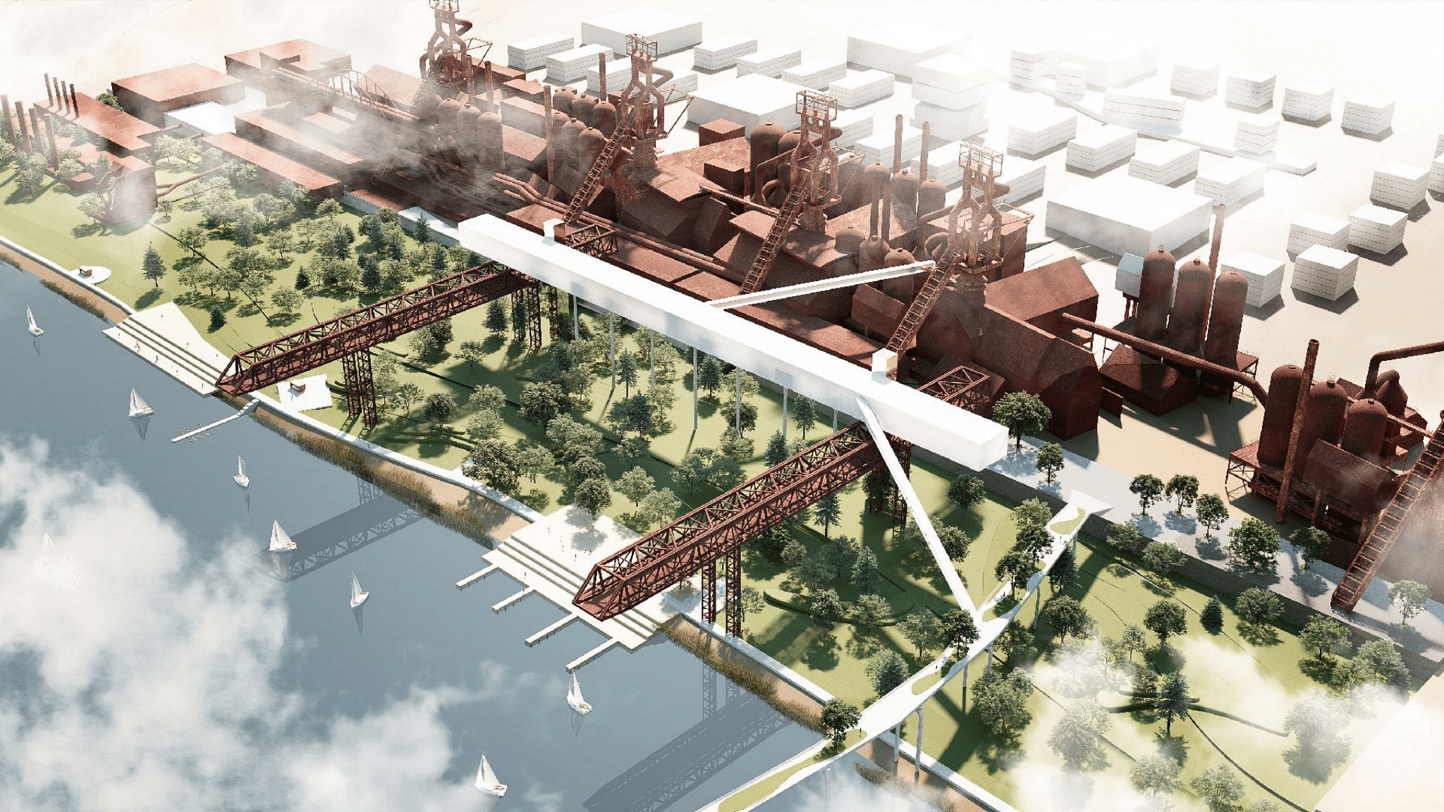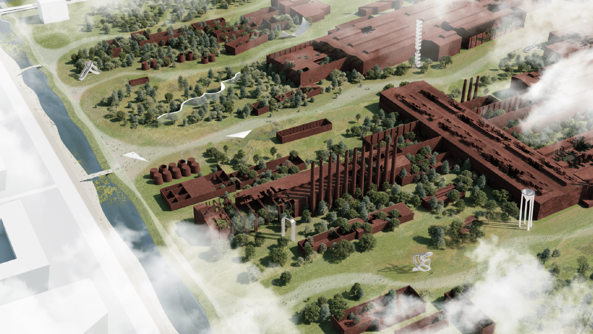 The architecture outside of the steel mill will preserve Mariupol’s industrial spirit, incorporating concrete, oxidized metal, brick facades, and other “brutalist” and “industrial” textures. Other local materials are also expected to be used: ceramic tiles, earthen walls, mosaics, and terrazzo.