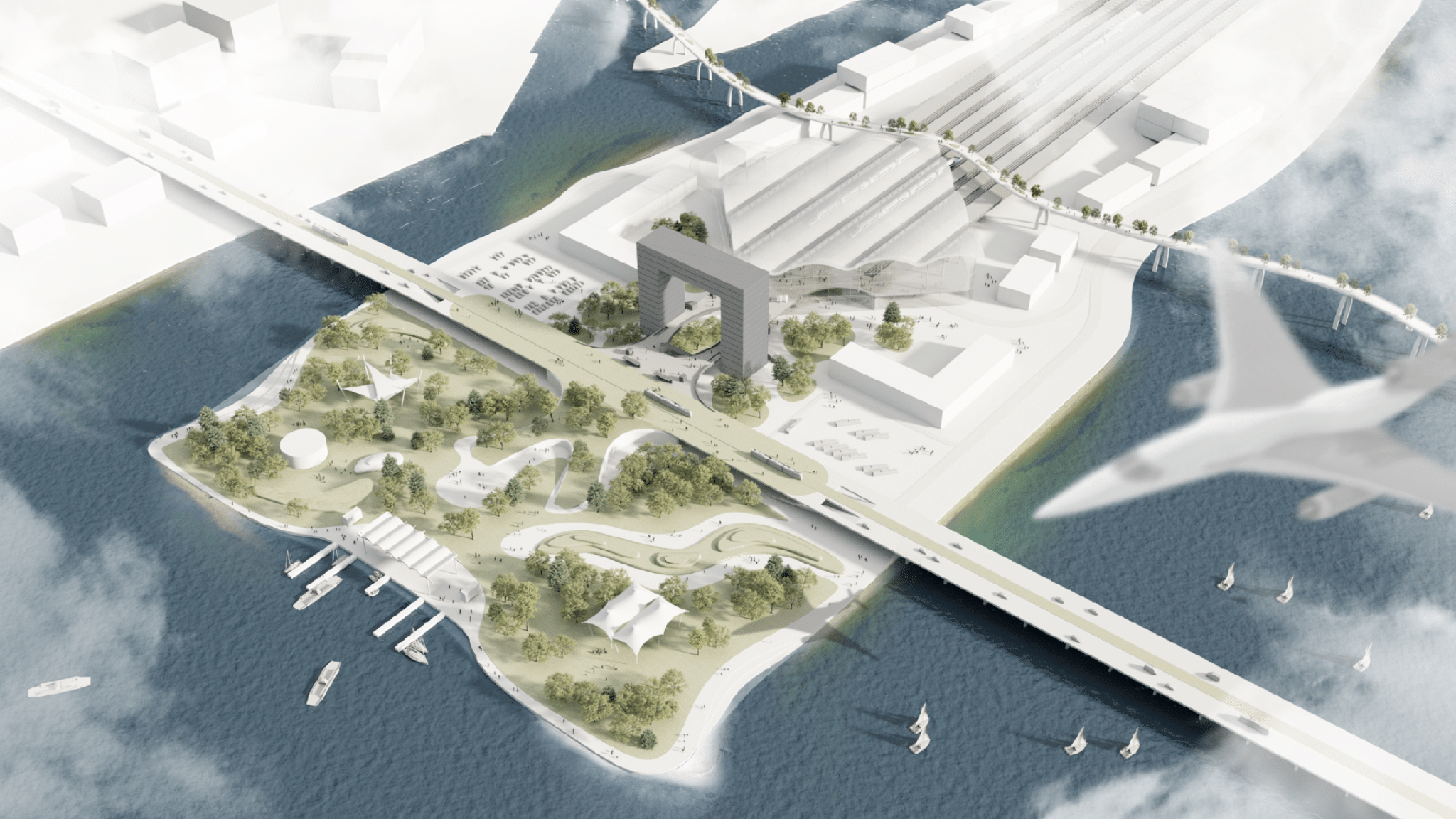 The plans show, for example, a main railway station made of glass located on “city island,” a peninsula at the mouth of the Kalmius River (the city’s railway station is currently located on the central beach). This is the geographical center of the city, but before the war, its territory was empty save for boat garages and railway tracks. The new station is designed in the form of a giant Cyrillic letter “П” — a nod to both the image of a triumphal arch and the Ukrainian word “перемога” (peremoha), which means “victory.”