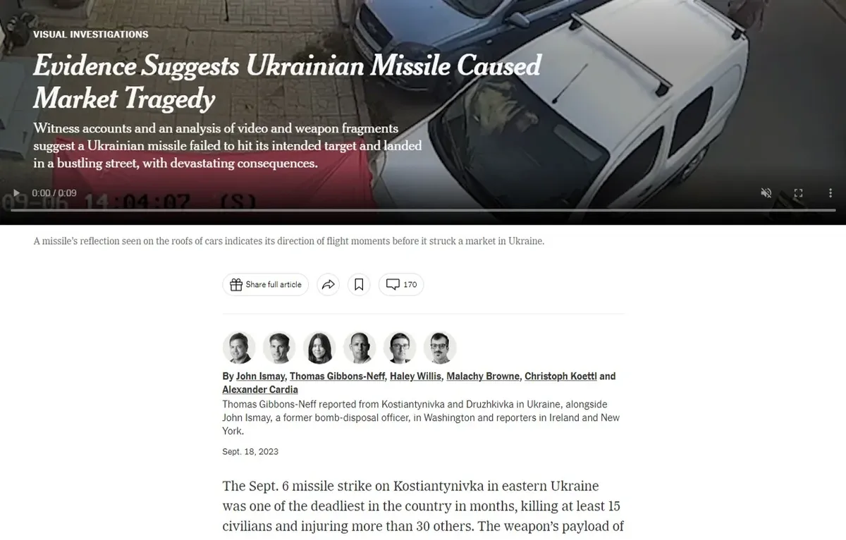 Одновременно «неназванный источник» украинского информагентства УНИАН сообщил, что один из авторов статьи Томас Гиббонс-Нефф, побывавший в Константиновке и Дружковке (откуда, как утверждается, были выпущены две украинские ракеты, одна из которых через считаные минуты предположительно попала в рынок Константиновки в результате ошибочного «дружественного огня»), «неоднократно замечен на продвижении российских нарративов, …он систематически готовит «антиукраинские материалы» в The New York Times, где «пытается дискредитировать Украину и ее армию».