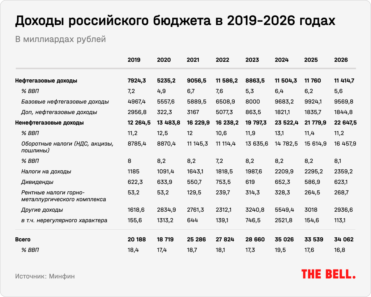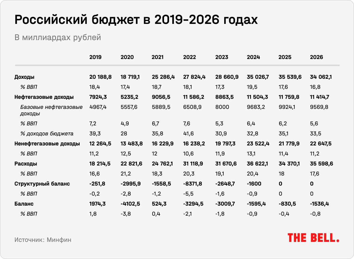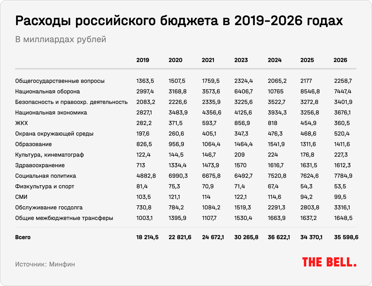 Рекордные военные расходы (10,8 трлн), социальные (7,5 трлн) и расходы на национальную безопасность (3,5 трлн) относятся к так называемым защищенным статьям бюджета. Это не только предохраняет их от возможных сокращений, но и предполагает, что оплачиваться они будут из так называемых «неконъюнктурных источников» — то есть не нефтегазовых доходов, а налогов. Остальные расходы бюджета не вырастут — то есть, с учетом инфляции, сокращаются.