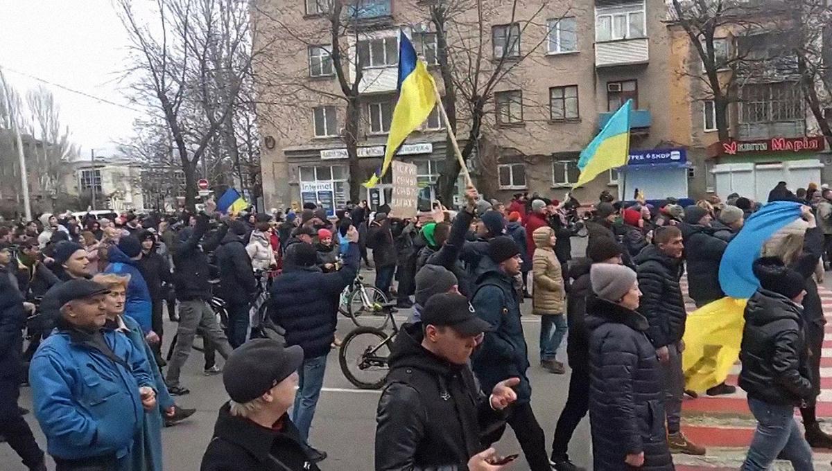 Жители Мелитополя протестуют против российской оккупации 2 марта 2022. В первые дни россияне практически не подавляли протесты. Похищения и пытки начались, когда российские спецслужбы обосновались в городе, открыли комендатуры и пыточныеФото: Reuters
