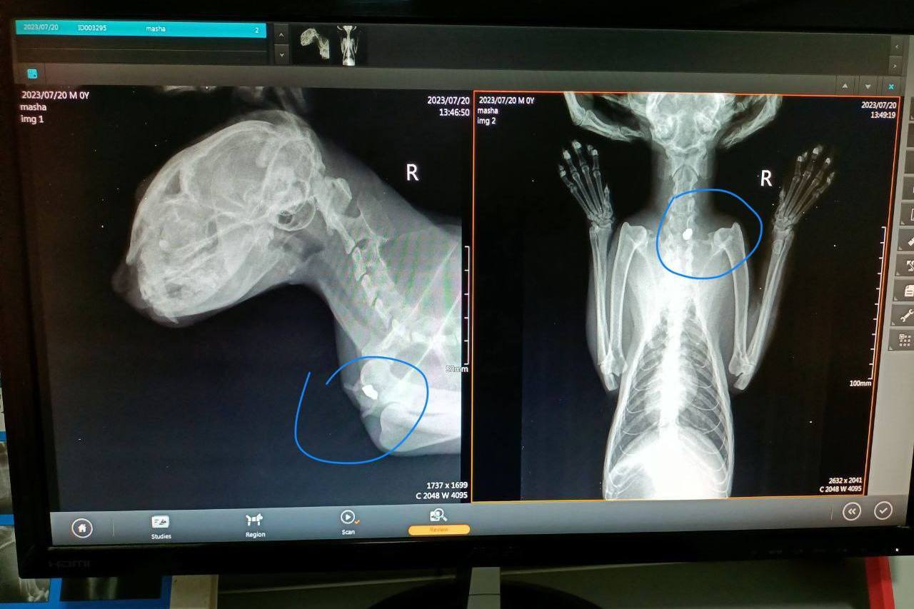 Кошку Машу этим летом нашли в истощенном состоянии в Ортачале. Изо рта у нее текли слюни, она не могла глотать. На рентгене ветеринары обнаружили пулю, которая прошла через щеку, горло и застряла в груди животного.