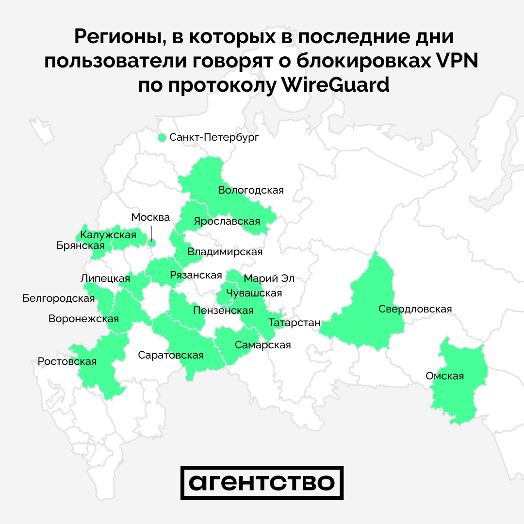 В регионах России выросла интенсивность блокировки VPN по протоколу WireGuard, который технические специалисты называют одним из самых удобных и распространенных, сообщили «Агентству» в проекте по мониторингу ограничений в интернете. Выросло и число регионов, из которых приходят жалобы на перебои в работе VPN-сервисов.