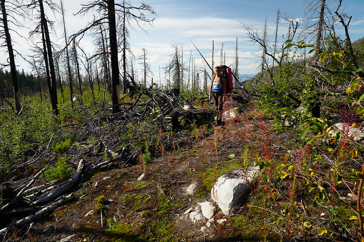 Последние километры мы идем по сгоревшему в 2015 году кедровому лесу. Тропа петляет мимо мертвых черных деревьев, ощущение — будто идешь через кладбище. Лес уже восстанавливается: появилась трава и малюсенькие кедровые деревья. Ася рассказывает, что они начали расти спустя четыре года после пожара — и все еще такие малыши. Чтобы восстановиться, лесу понадобится 50 лет.