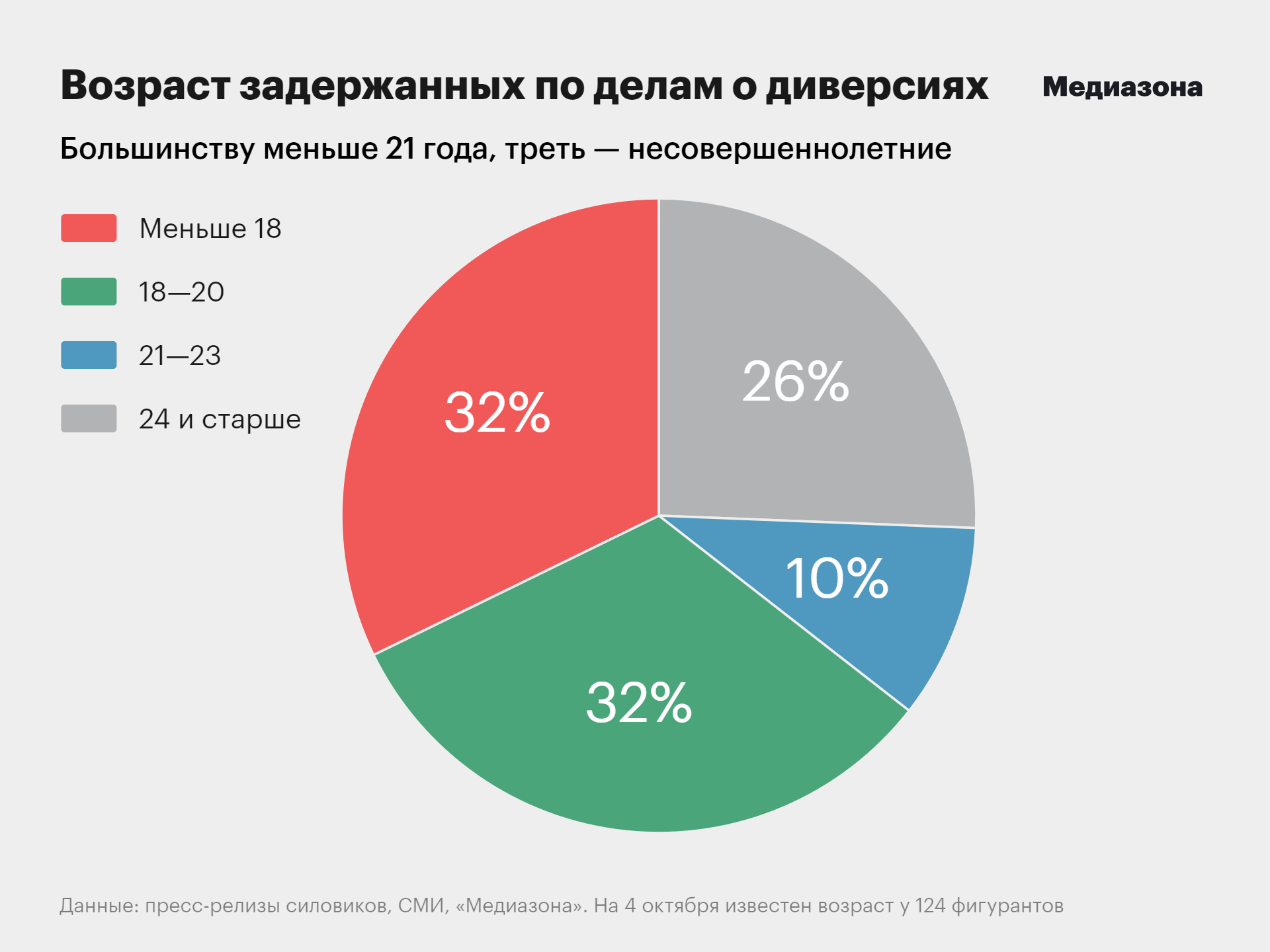 Большинство предполагаемых диверсантов — совсем молодые люди. Мы знаем возраст у 124 обвиняемых. 39 из них на момент задержания не было даже 18 лет. Еще 55 человек — в возрасте от 18 до 25 лет. И только 17 — старше 35.