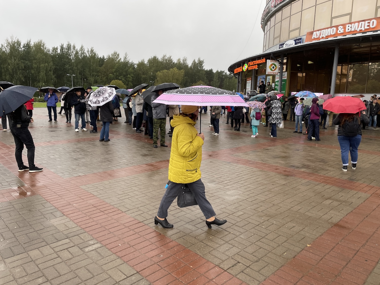 Суббота, порывистый ветер, дождь. Около 60 человек собрались на площади у ТРК «Галактика» в Сосновом Бору (Обновление: позднее участники акции сообщили, что собрали 170 подписей, по их оценкам, на площади было более 100 человек.). Жители выступают против строительства глиноземного завода «Русала» в 7 километрах от областного города. Жители боятся ухудшения экологической ситуации в городе, где работает атомная электростанция.