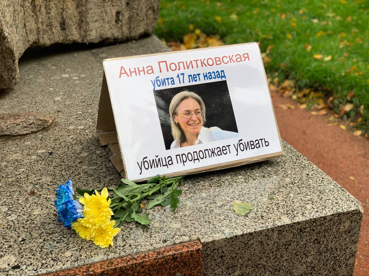 Цветы с утра приносят к дому Политковской в Москве, где её убили, и к зданию редакции "Новой газеты". Также их принесли к Соловецкому камню в Петербурге, передает Север.Реалии.