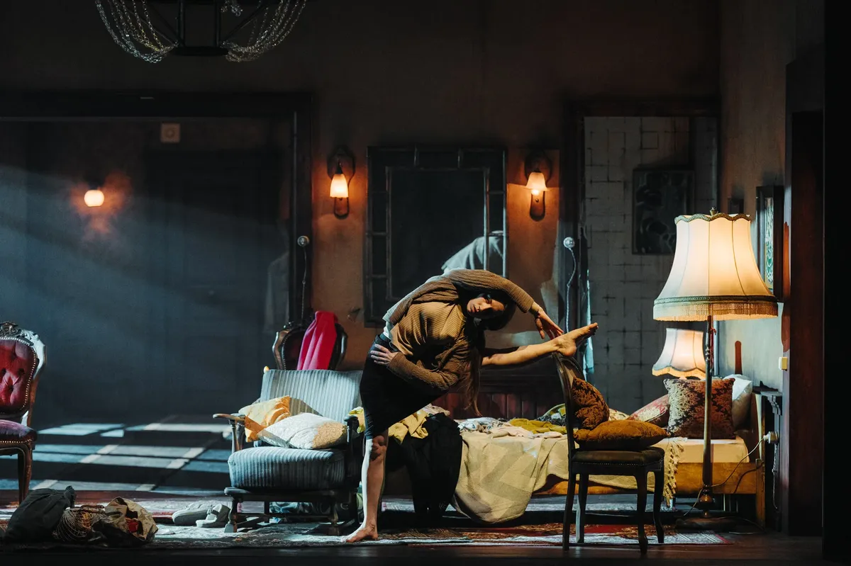 Часть спектакля проходит без слов, и кажется, что в этом молчании напряжение достигает максимального накала. Метафоры возникают в голове сами собой: пожар в нью-йоркской квартире Крымовых, в котором пострадал режиссер (о спектакле договорились еще до этого события), ситуация в России. О последней, кстати, мои уехавшие друзья однажды так и выразились: «Всё горит, а ты думаешь, какие фужерчики стояли в том шкафу», имея в виду дискуссию вокруг «Золотой маски» или очередной «отмены» очередного режиссера.
