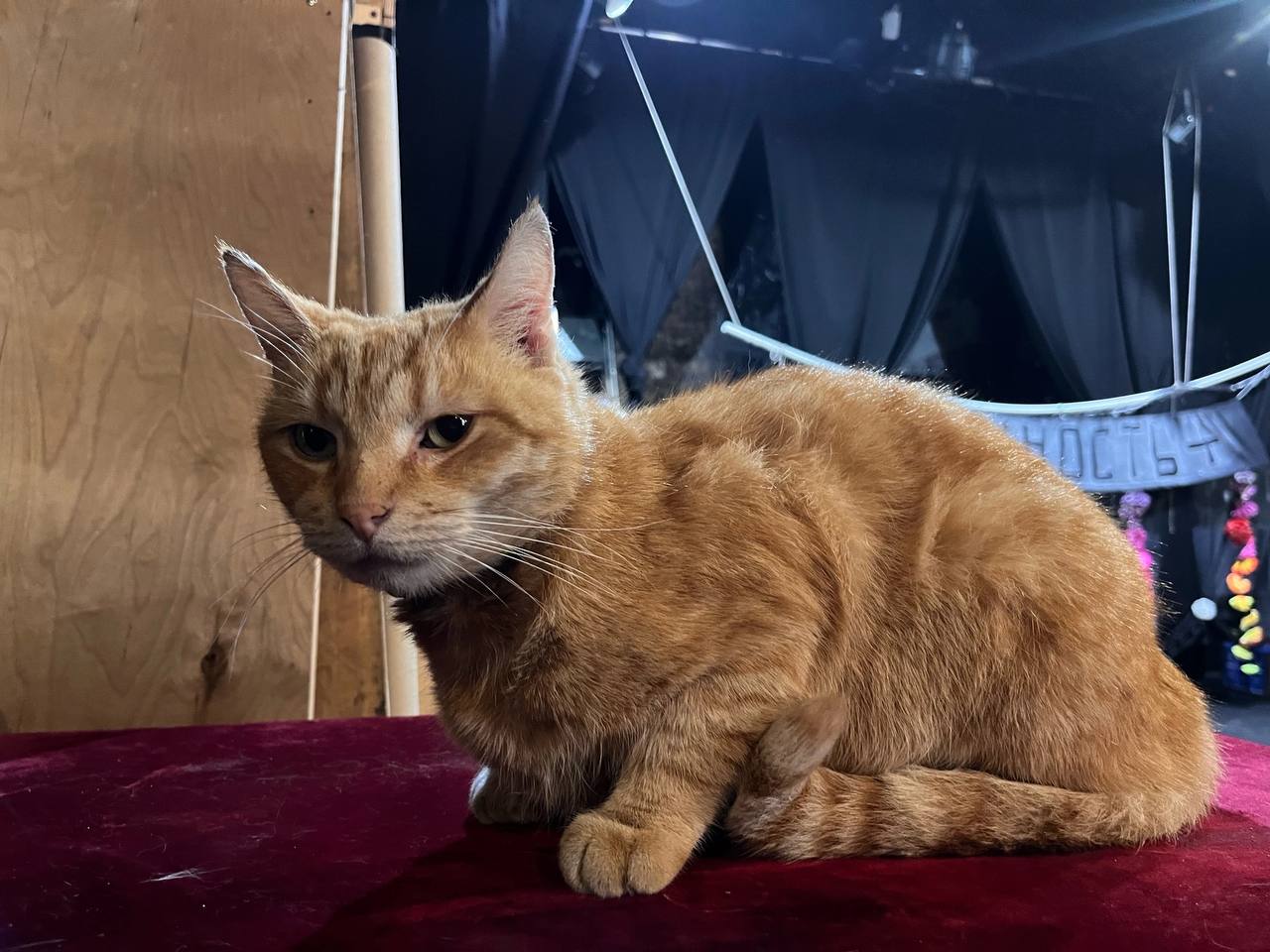 Станиславский — рыжий с полосками кот семи лет, кастрирован, у него немного надорвано ухо и есть царапина на носу. Он «свободно гулял во дворе, в сквере Низами и на территории Первого Меда, мы его недавно помыли и надели новый ошейник от блох (розово-бежевый)», — говорят сотрудники театра.