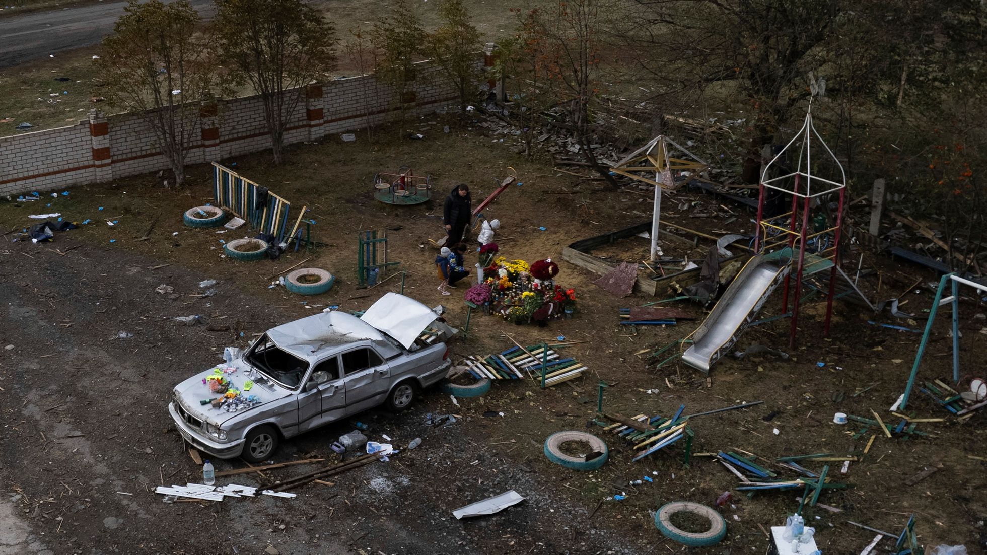Мемориал в Грозе. В селе под Харьковом погибли 52 жителя. Их родные и друзья приносят цветы на заваленную обломками детскую площадку