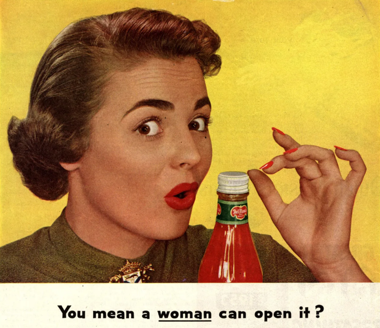 Реклама новейших алюминиевых крышечек компании Alcoa Aluminium: «Это так просто — не нужно ни ножа, ни открывашки для бутылок… ни даже мужа! — Вы хотите сказать, что это сумеет открыть женщина (подчеркнуто)?» В рекламе 1950-х годов то, что позднее назовут сексизмом, было в порядке вещей.
