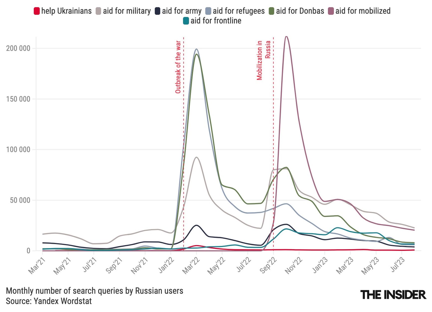 Notably, whereas socially active Russians were looking for information on how to help refugees and Donbas when the war broke out, they switched their focus almost exclusively to helping the military in the following months, especially after Russia announced mobilization. Meanwhile, queries related to helping Ukrainians (as opposed to abstract “refugees” or Donbas) aren't popular anymore.