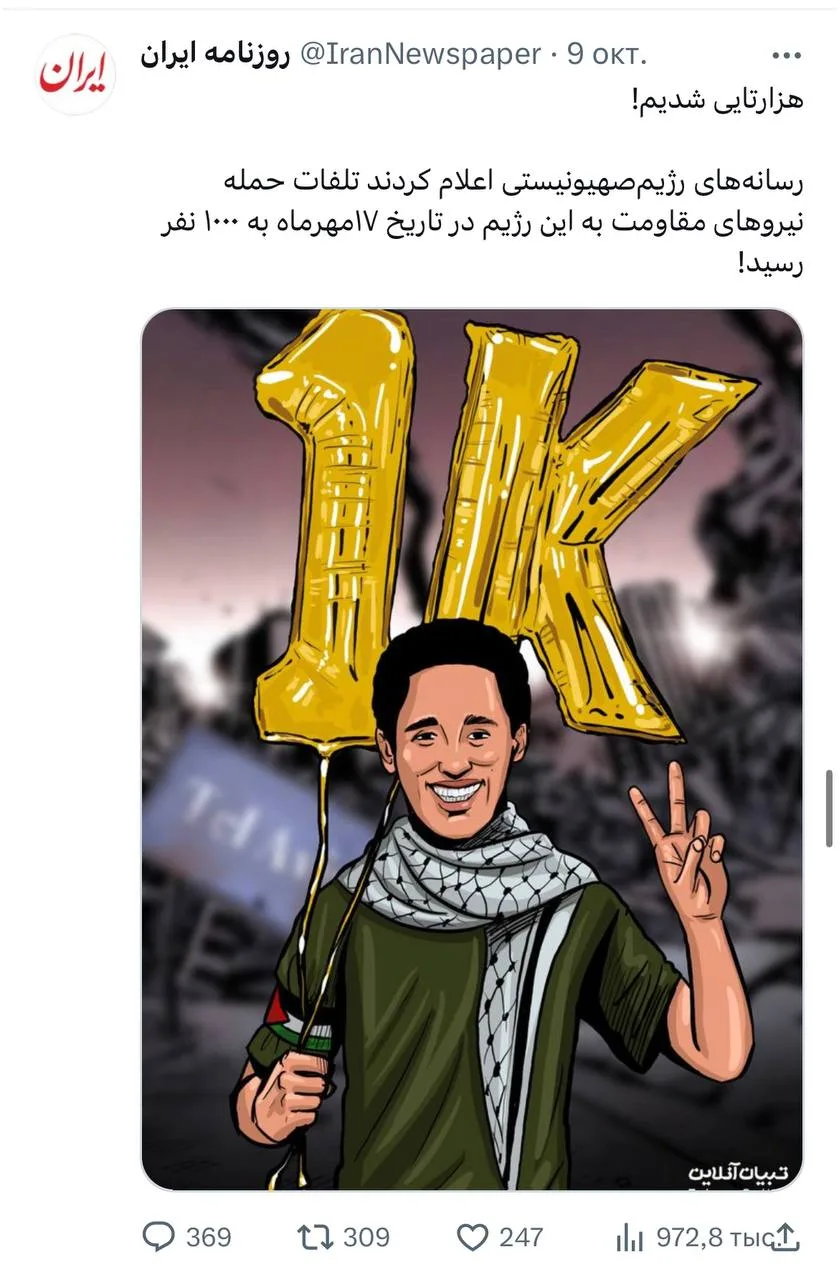 Государственная иранская газета поздравила читателей с 1000 погибших израильтян.