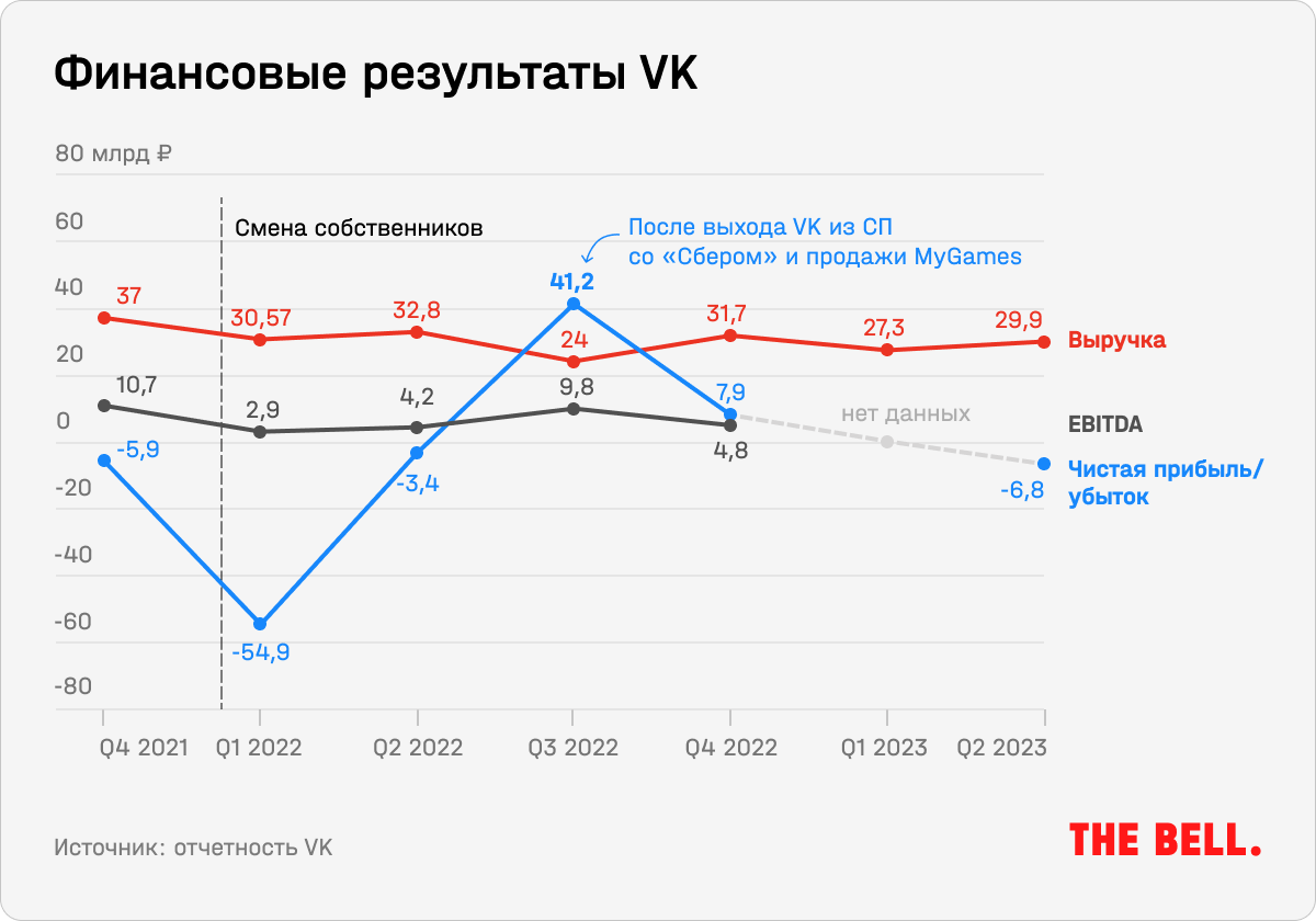 Несмотря на рост аудитории соцсетей и рекламной выручки после покупки «Дзена» и блокировки в России иностранных конкурентов, первое полугодие VK закончила с убытком 11,3 млрд рублей, EBITDA группы сократилась на 42%, до 3,9 млрд, что оказалось сильно ниже прогнозов аналитиков. Операционные расходы VK выросли год к году на 14 млрд рублей (до 54 млрд рублей), а сумма непогашенных кредитов и облигаций по сравнению с концом прошлого года увеличилась на 48,2 млрд рублей, до 172,7 млрд. Рост VK обеспечивается в том числе из средств ФНБ: в апреле Минфин профинансировал из него покупку облигаций компаний на 60 млрд рублей.