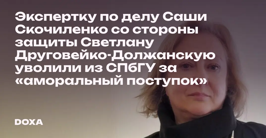 Филологиня Светлана Друговейко-Должанская, сделавшая экспертизу по делу Саши Скочиленко, была уволена из Санкт-Петербургского государственного университета по представлению Комиссии по этике, написал в своем канале депутат Законодательного собрания Петербурга Борис Вишневский. Друговейко-Должанская подтвердила это «Медиазоне».