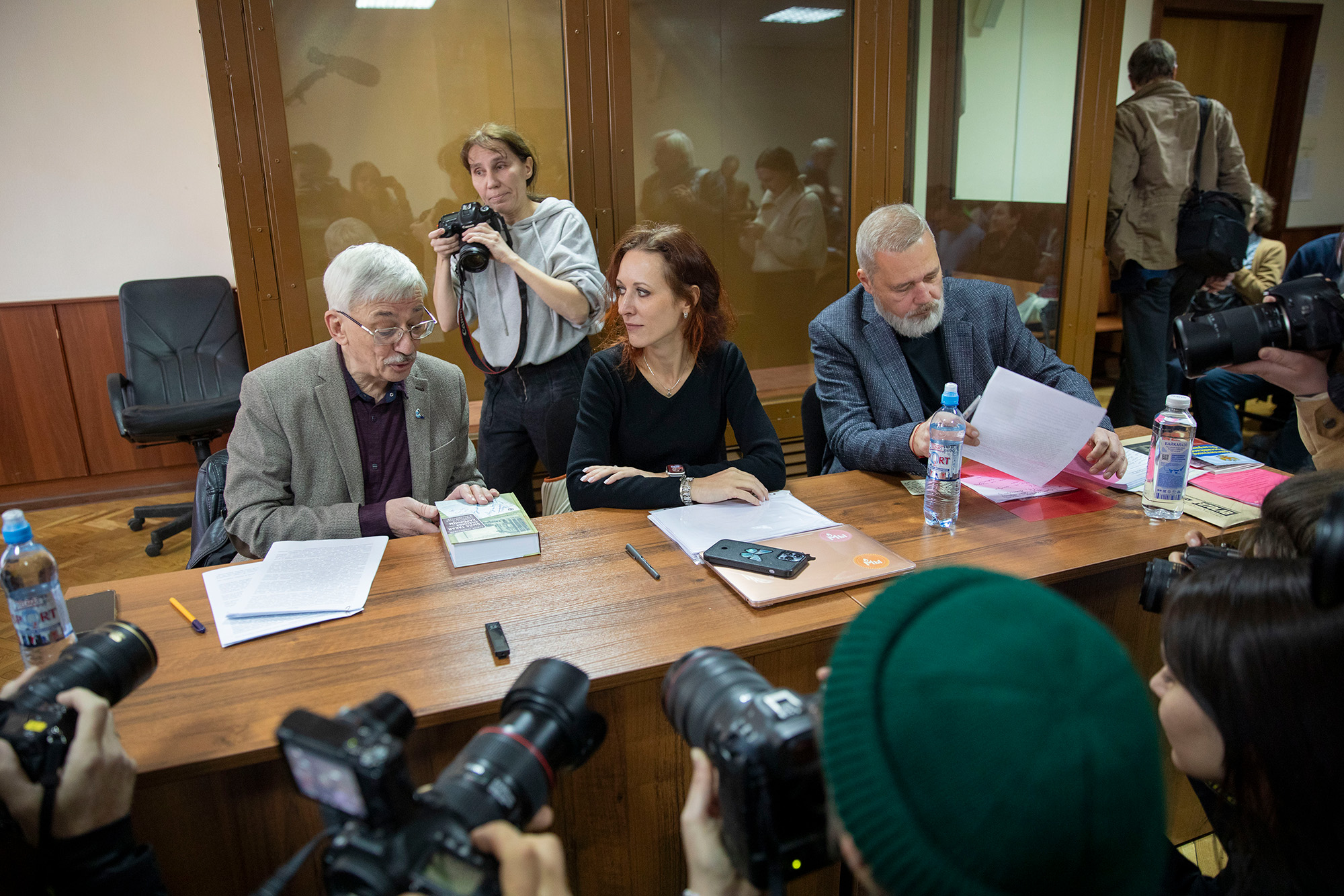 Сопредседатель «Мемориала» Олег Орлов, адвокат Катерина Тертухина и Дмитрий Муратов в качестве общественного защитника. Фото: Александра Астахова / Медиазона