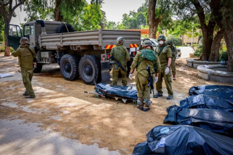Израильские солдаты выносят тела в кибуце Кфар-Аза, недалеко от границы с сектором Газа