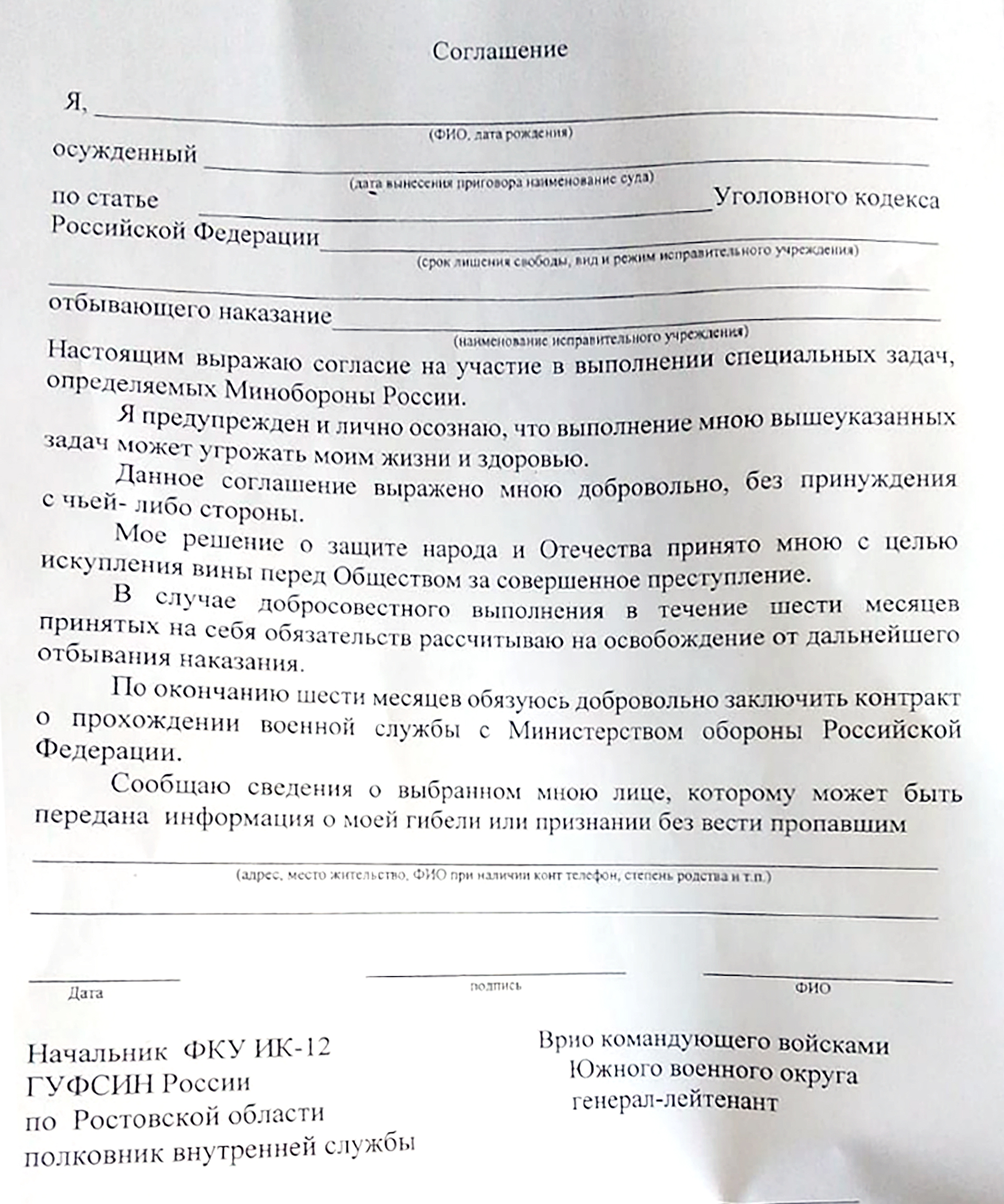Такое соглашение осужденные подписывают с Минобороны. Фото предоставлено родственником экс-заключенного