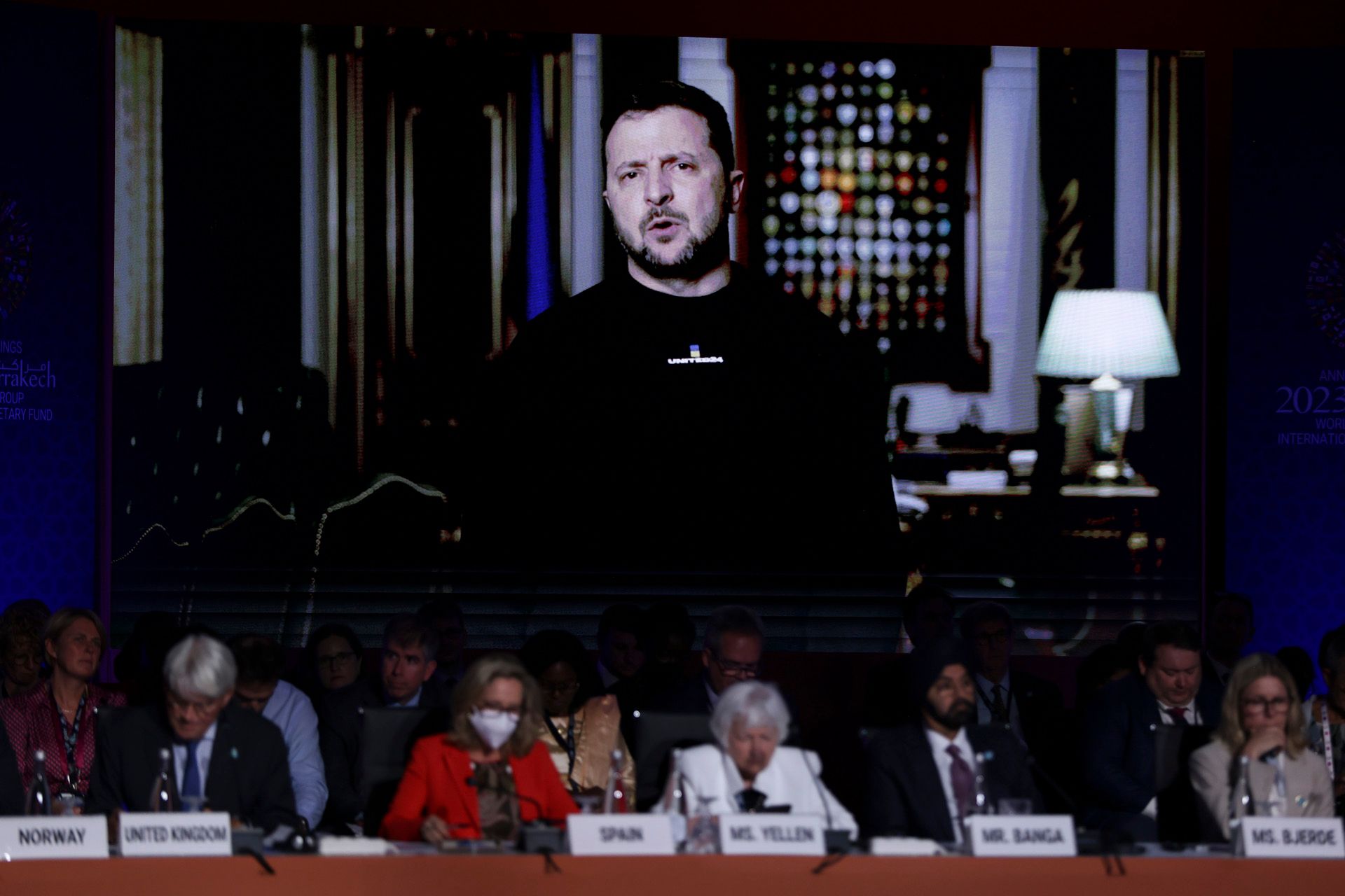 Президент Украины Владимир Зеленский выступил по видеосвязи на круглом столе во время ежегодного заседания Международного валютного фонда и Всемирного банка, который проходит в марокканском Марракеше. Он поблагодарил международное сообщество за поддержку Украины.