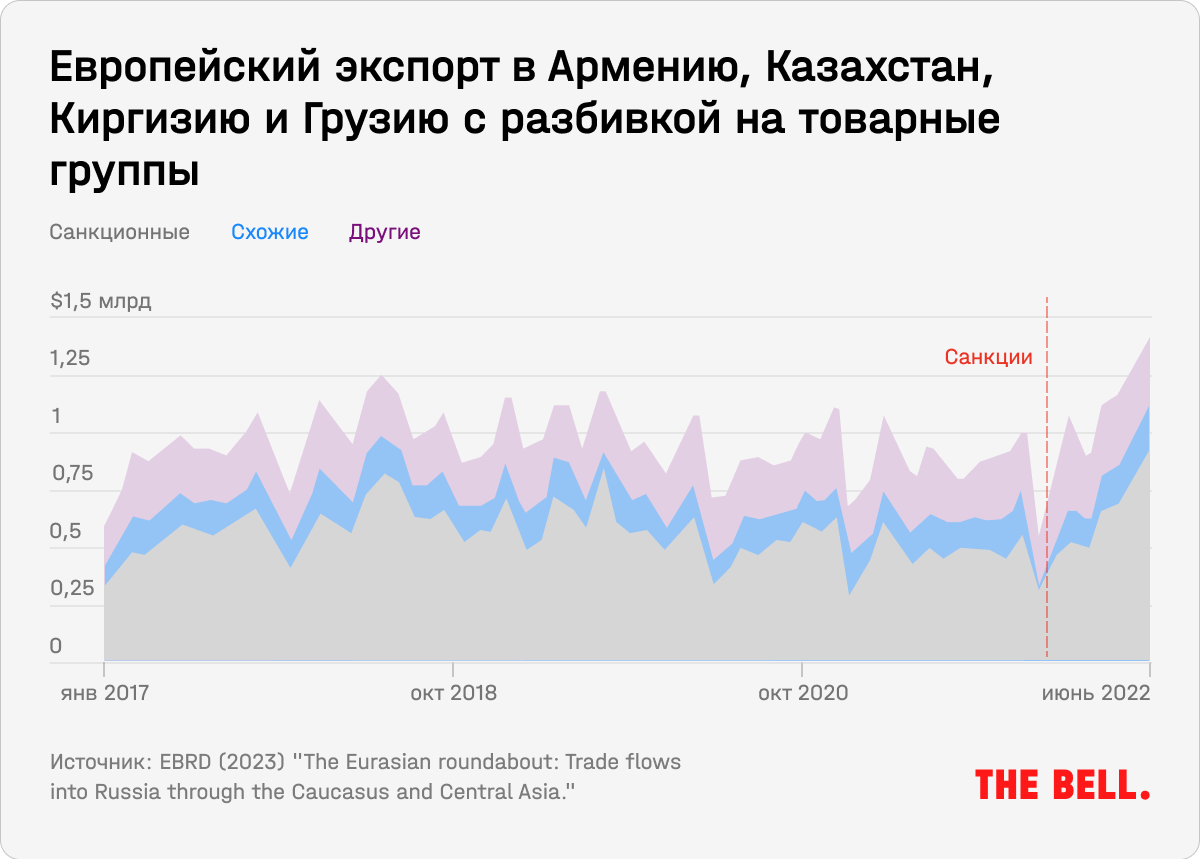 Тот факт, что соседние с Россией страны увеличили европейский импорт товаров, попавших под санкции, и аналогичные им, может говорить о том, что так Москва обходит ограничения со стороны ЕС, писали в февральском докладе экономисты Европейского банка реконструкции и развития, изучившие экспортные потоки из Армении, Казахстана, Киргизии и Грузии. Но даже то, что Россия поставляет из этих стран ЕАЭС, лишь на 5% покрывает потерю санкционных товаров, указывали авторы.