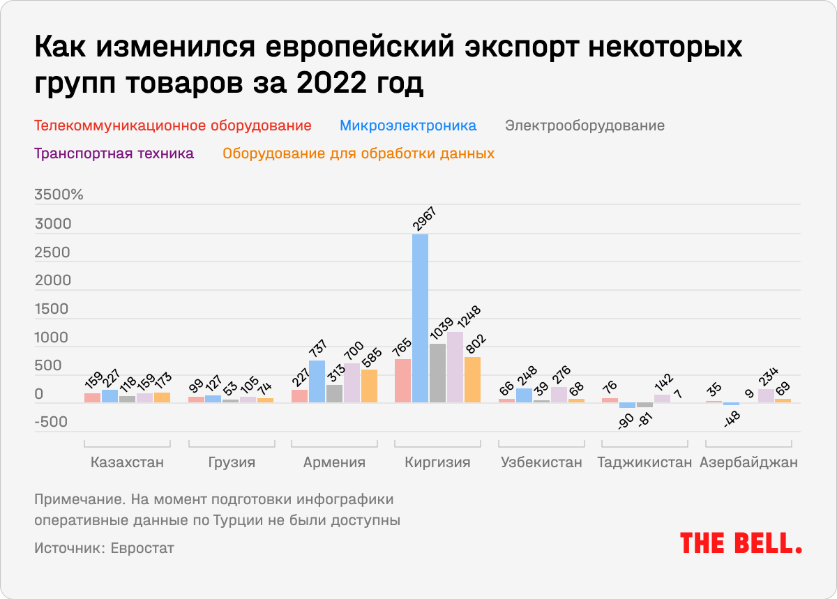 За 2022 год соседние с Россией страны существенно нарастили европейский импорт определенной группы товаров, говорится в отчетах Евростата. Среди них: телекоммуникационное оборудование, микроэлектроника, электрооборудование, транспортная техника, электронное оборудование для обработки данных (компьютеры, серверы, жесткие диски, смартфоны, компьютерная периферия).