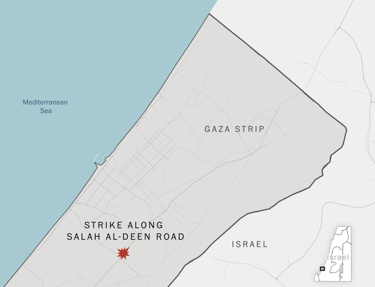 Издание Washington Post геолоцировало видео — оно снято на шоссе Салах ад-Дин, соединяющем северную и южную части сектора Газа. Журналисты отмечают, что первыми место съемки определили OSINT-аналитики Крис Осиек и Габор Фризен. Они пишут, что обстрел произошел накануне, около 17:20 по местному времени (совпадает с московским). Палестинский Минздрав также называл шоссе Салах ад-Дин одним из мест, где колонны беженцев попали под обстрел.
