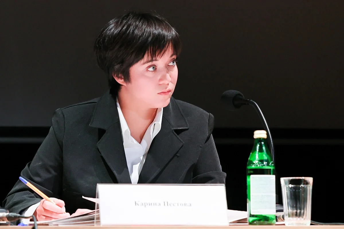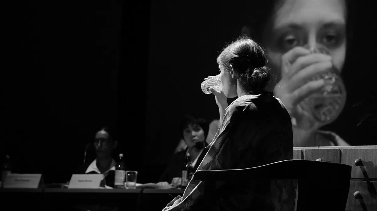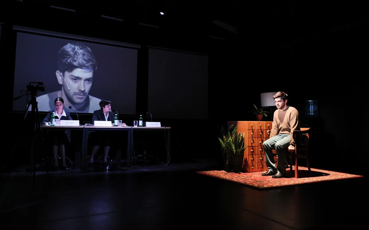 На сцене все скромно: кулер с водой, библиотечные ящички, торшер, экран. За столами члены комиссии, задающие сухие уточняющие вопросы. Правда, пару раз они не выдерживают, резко уходят к темному заднику сцены — отдышаться.