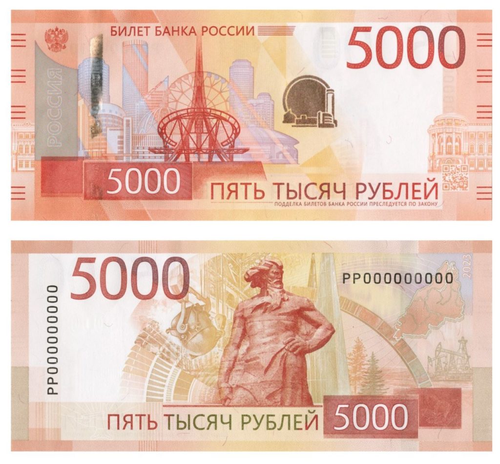 Новая пятитысячная купюра посвящена Екатеринбургу и Уральскому федеральному округу. Так, на лицевой стороне банкноты будет изображение стелы «Европа-Азия», а на оборотной — памятника «Сказ об Урале» в Челябинске и стелы «66-параллель» в Салехарде. Прежняя пятитысячная купюра была посвящена Хабаровску.