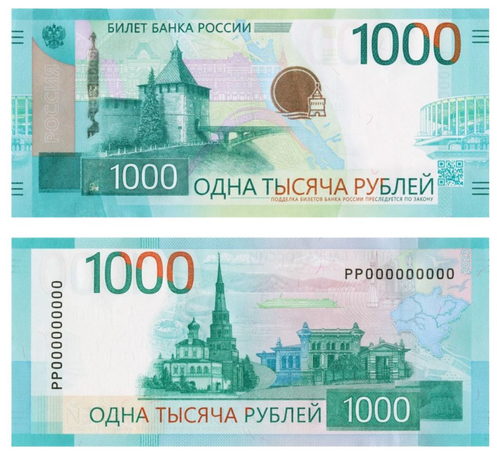 На новой тысячерублевой купюре на одной стороне изображена Никольская башня Нижегородского кремля, а на другой — Музей истории государственности татарского народа и Республики Татарстан в Казани, башня Сююмбике, а также Музей археологии и этнографии в Уфе. На старой банкноте этого номинала были изображения памятника Ярославу Мудрому, часовни иконы Казанской Божьей Матери, Ярославского кремля и герба Ярославля.