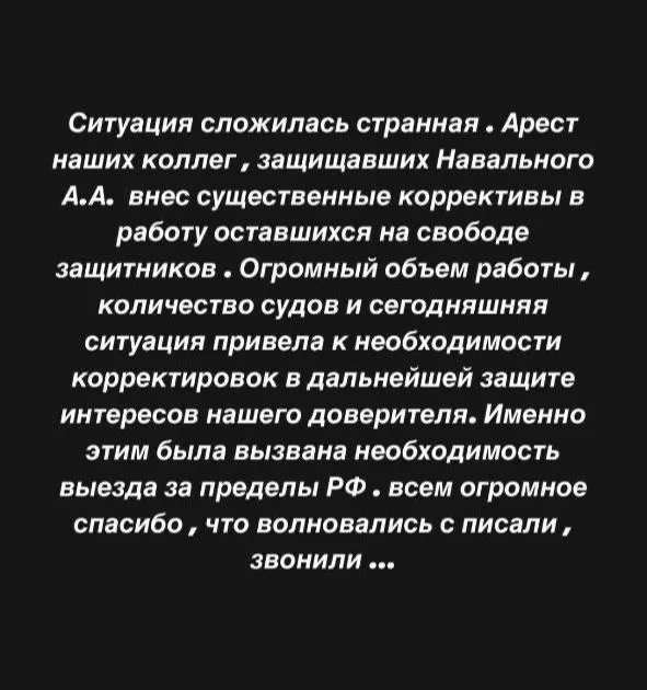 «Ситуация сложилась странная. Арест наших коллег, защищавших Навального, внес существенные коррективы в работу оставшихся на свободе защитников», — написал он.