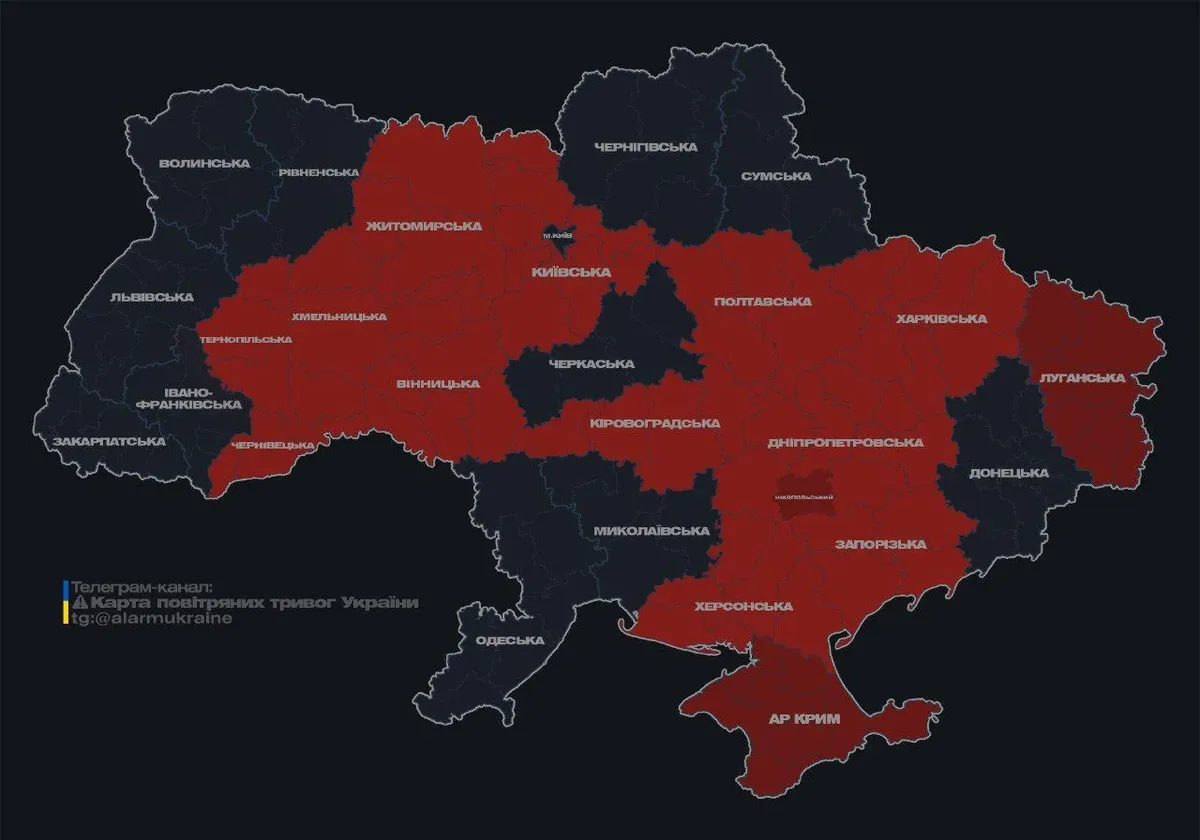 По данным Воздушных сил ВСУ, угроза ракетного обстрела была в Сумской и Полтавской областях, а Днепропетровская, Херсонская, Николаевская, Харьковская и Кировоградская области оказались под угрозой налета дронов Shahed.