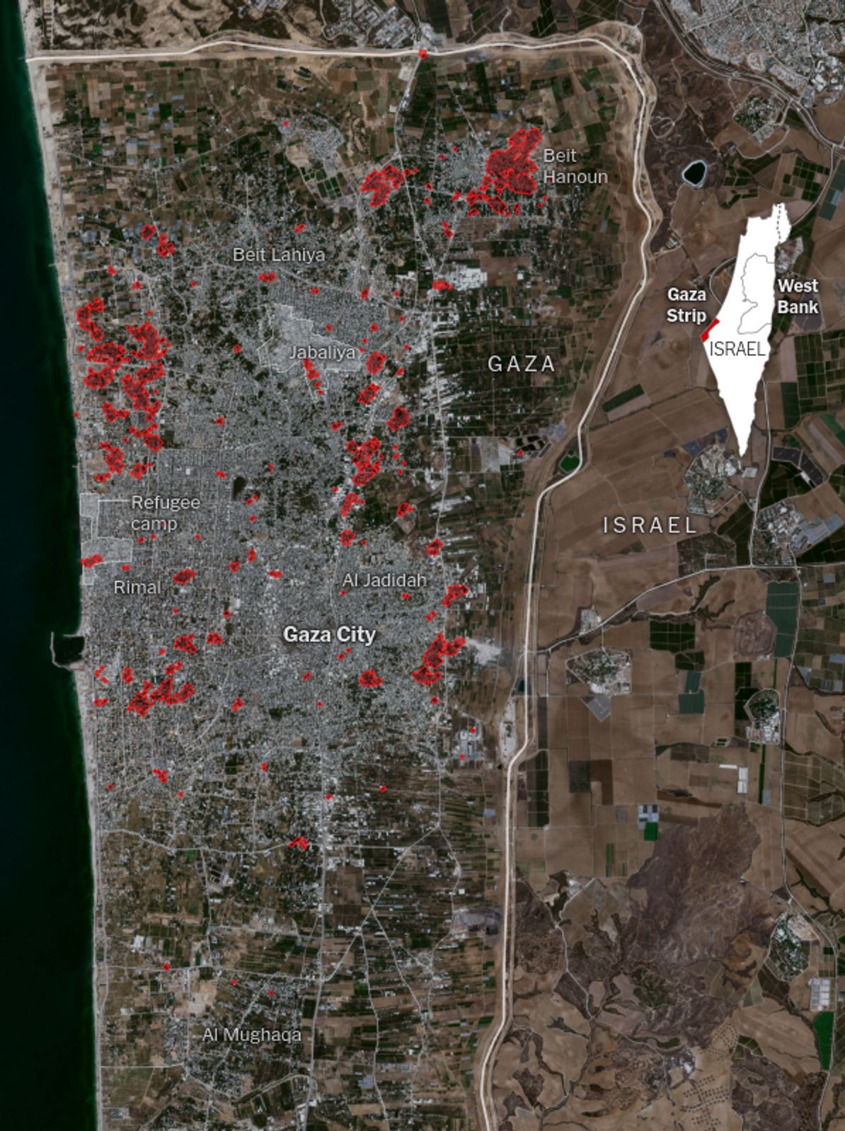 Определенные на основе анализа спутниковых снимков места воздушных ударов по северной части сектора Газа