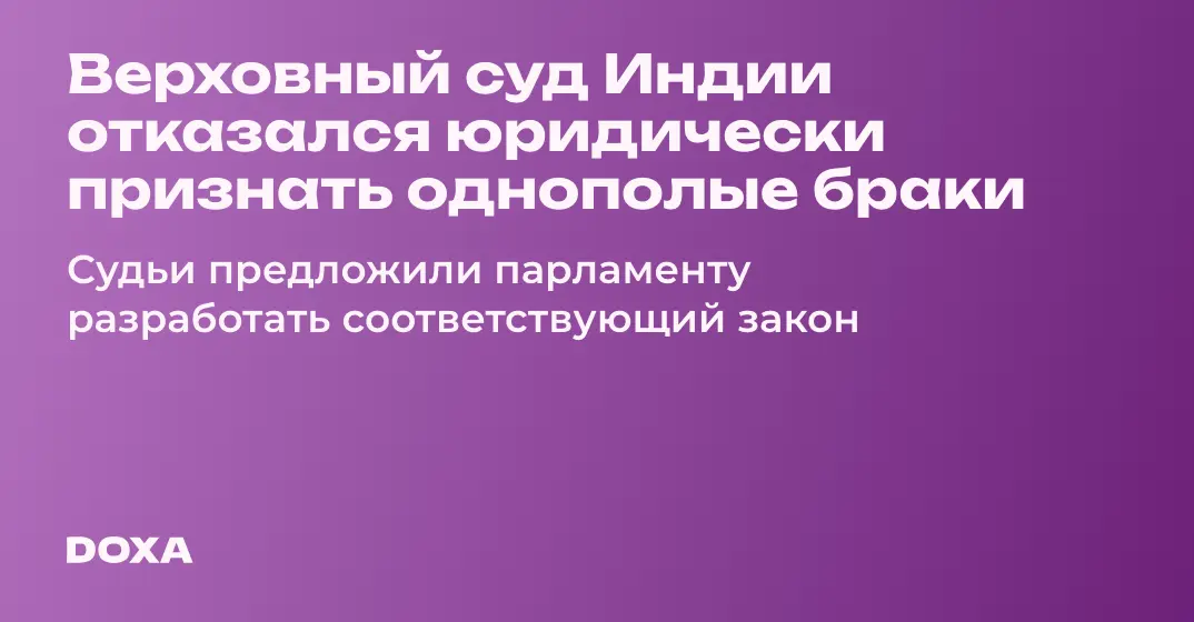 Конституционная коллегия Верховного суда Индии отказалась от юридического признания однополых браков — она решила, что текущее семейное законодательство не предусматривает такой возможности, следовательно, легализация однополых браков должна вводиться специальным законом, сообщает India Today. При этом суд подтвердил, что не состоящие в браке гомосексуальные пары имеют право на усыновление детей, а трансгендерные люди имеют право вступать в брак с людьми противоположного пола.