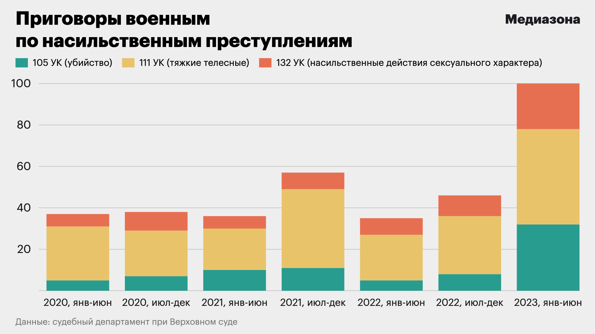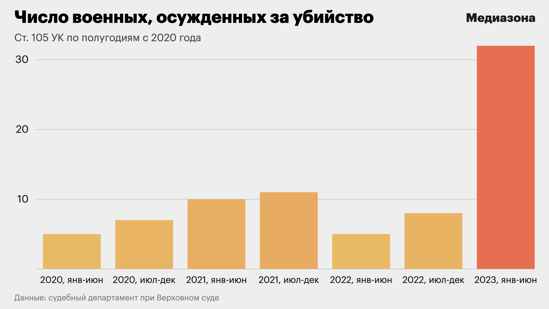 До 2023 года суды выносили меньше 20 приговоров об убийстве (105 УК) в год по делам, в которых подсудимыми были военнослужащие. В 2023 году суды вынесли уже 32 таких приговора только за первые шесть месяцев.