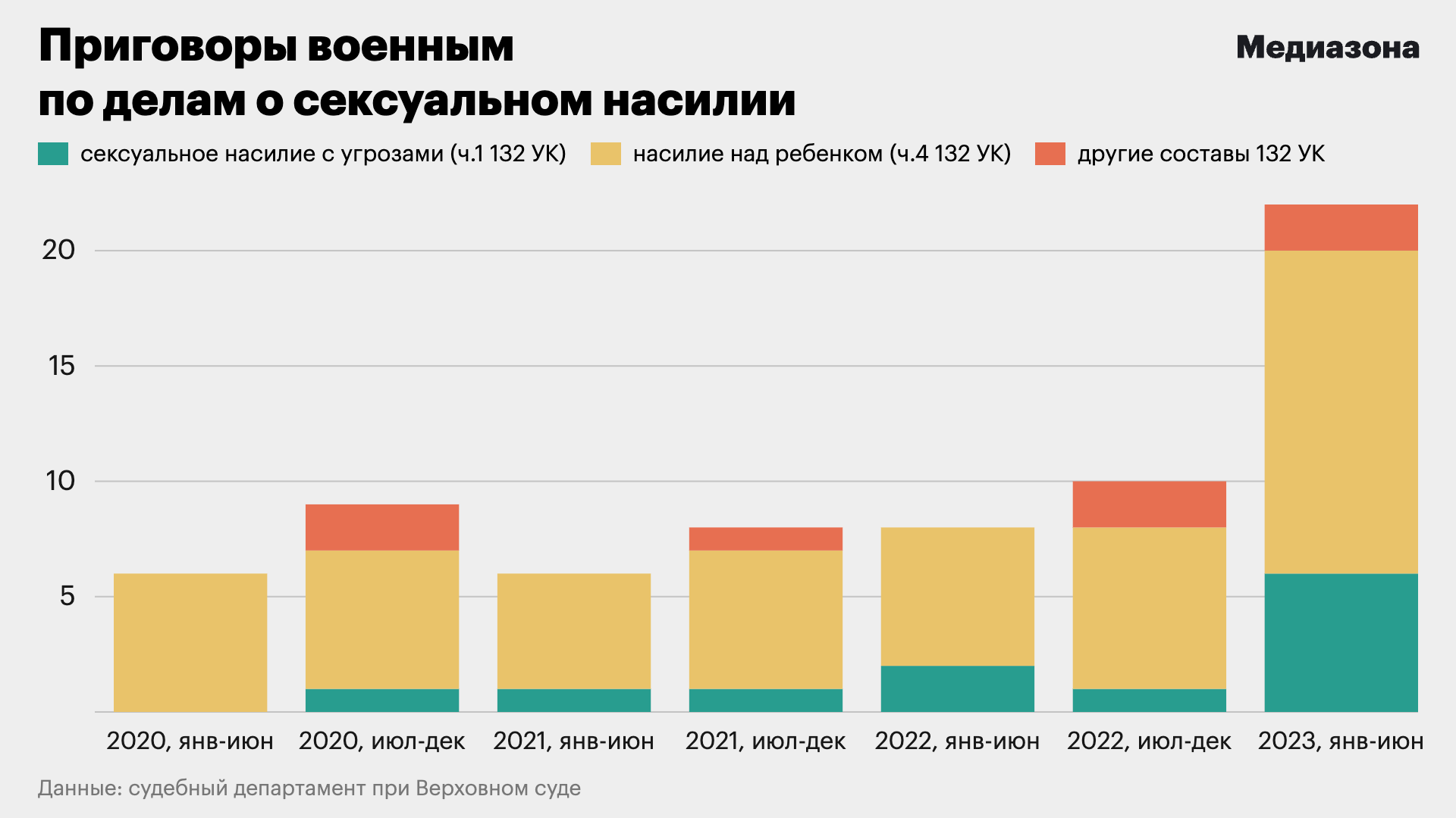 Кроме того, значительно выросло число приговоров о насильственных действиях сексуального характера (132 УК): в первом полугодии 2023 вынесено 22 таких приговора; в предыдущие полугодия суды выносили от 6 до 10 приговоров по этой статье.