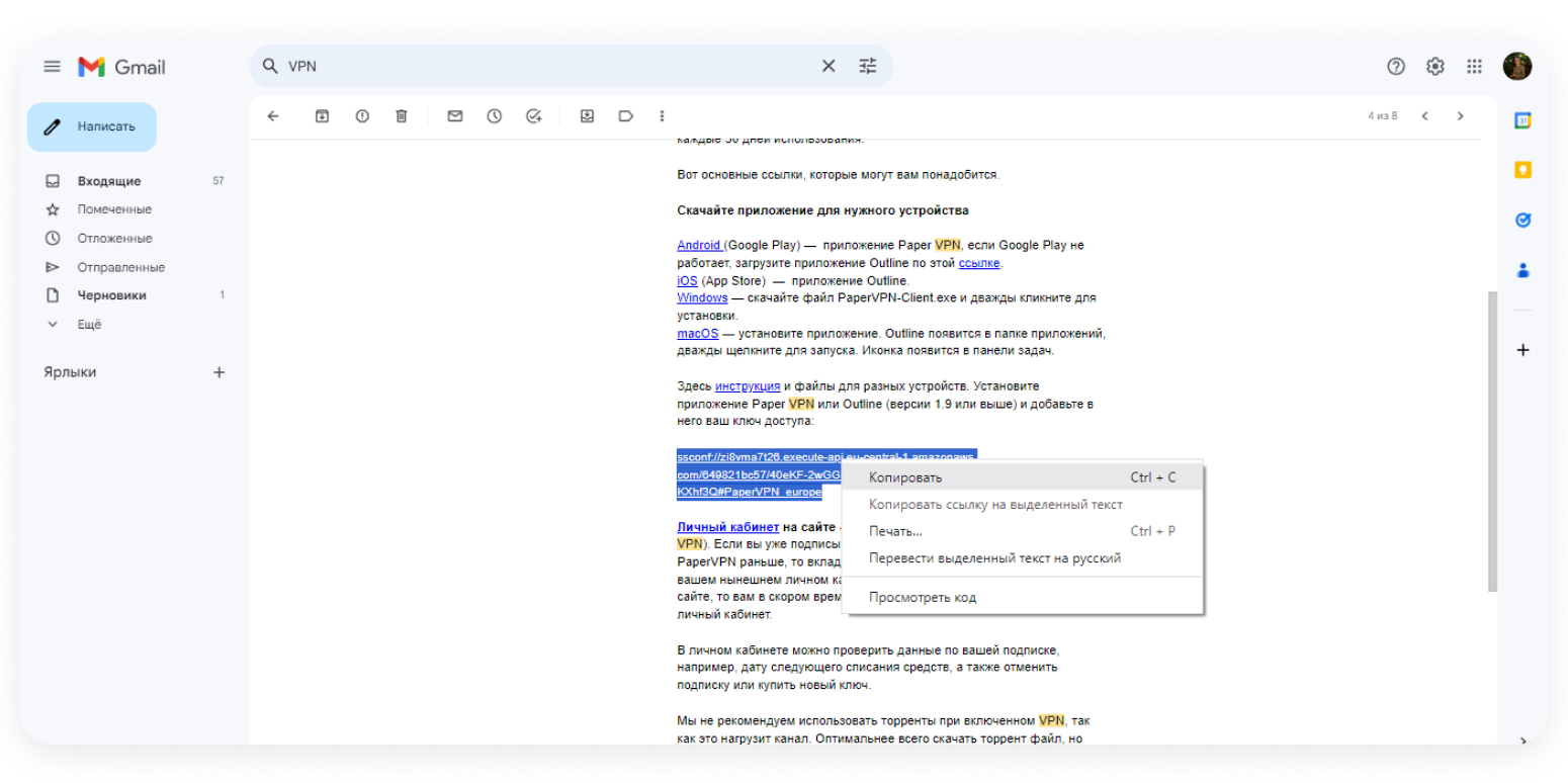 Шаг 3. Пока идет установка, зайдите в почту, которую вы указали при покупке сервиса, и найдите письмо от Paper VPN. Откройте его и скопируйте ключ доступа — он начинается с символов ssconf: