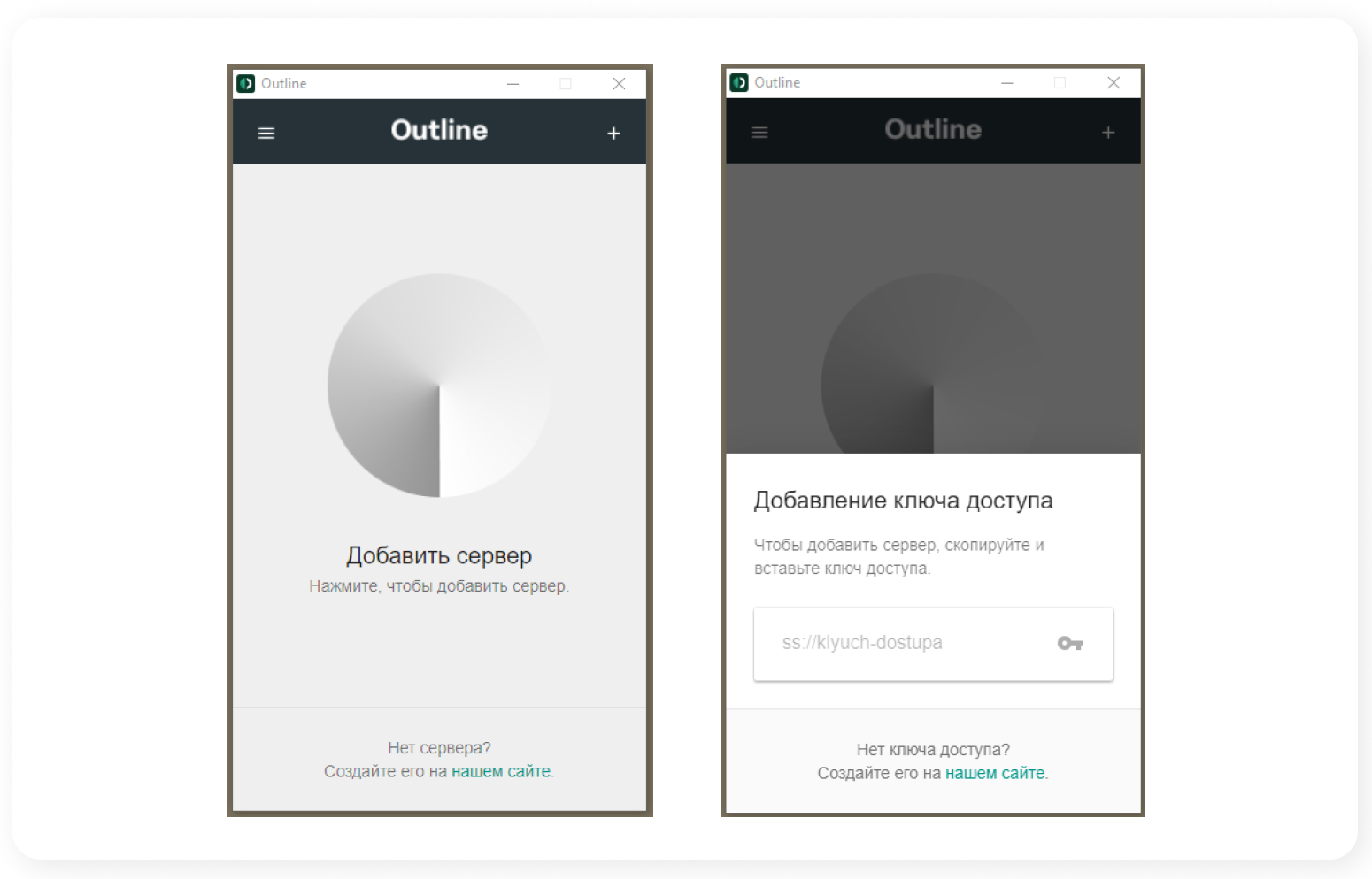 Шаг 4. После установки программа Outline запустится на компьютере сама. Если этого не случилось, найдите зеленую иконку программы на рабочем столе и кликните по ней дважды. В обоих случаях вы увидите вот такое окно: