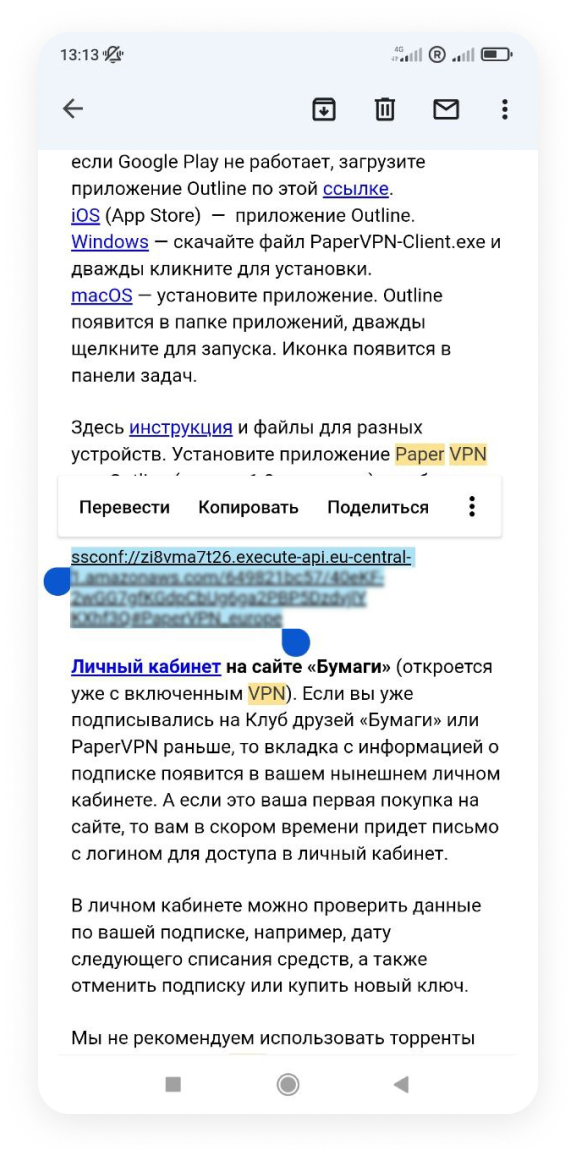 Шаг 2. Пока приложение скачивается, зайдите в почту, которую вы указывали при оформлении подписки, и найдите письмо от Paper VPN с темой «Спасибо, что подписались на VPN-сервис „Бумаги“». Скопируйте ключ доступа — он начинается с символов ssconf: