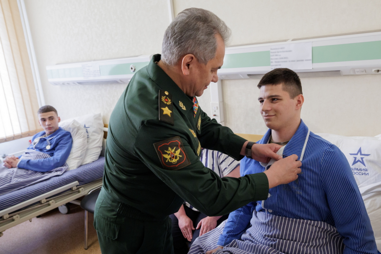 Министр обороны Сергей Шойгу вручает награду российскому военному в госпитале