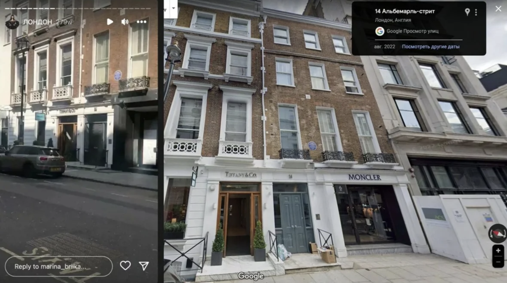 Пока ее отец приветствовал присоединение Крыма, Марина заканчивала двухлетнюю магистратуру в Лондонской школе бизнеса и финансов и жила в центре города по адресу: 14 Albemarle St, London W1S 4HL (она сама об этом позже, в 2018-м, рассказывает и показывает, видео в соцсетях: «и прямо внизу тут «Тиффани», и мы с Сабриночкой тут жили в соседних квартирах». — А. Т.). Последняя продажа квартир в доме состоялась за 21 млн фунтов, а аренда обходится не меньше 558 фунтов в неделю.