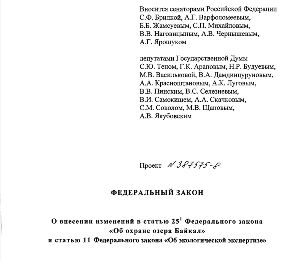 Законопроект вступает в прямое противоречие с принципами охраны Байкальской природной территории. Законопроект содержит ряд серьезных рисков для экологической безопасности, для сохранности уникальной экосистемы озера Байкал. […] Антропогенная нагрузка на Байкал запредельная сегодня. Если мы любой другой шаг сделаем, не обосновав это с научной точки зрения, без очень внимательного и глубокого изучения последствий, мы потеряем уникальное природное явление.