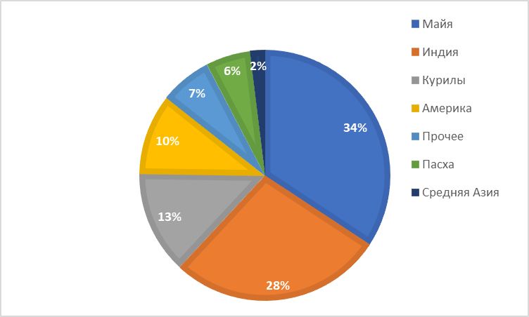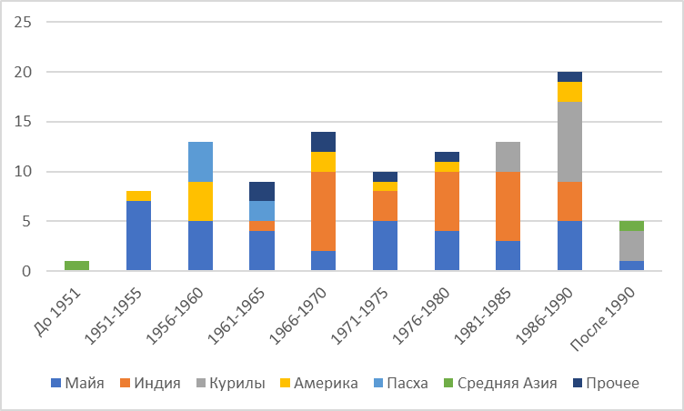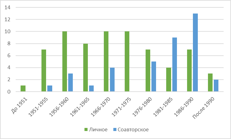 Здесь представляется уместным привести тематическое (рис. 1) и хронологическое (рис. 2) распределение работ ученого. Оно лишь примерное, поскольку, с одной стороны, до сих пор иногда удается найти работы, которые отсутствуют в изданных библиографиях, а с другой — можно по-разному учитывать многочисленные переводы его работ, особенно на фоне того, что, например, в его книге «Иероглифические рукописи майя» 1975 года и в ее английском переводе 1982 года различаются некоторые чтения знаков. Также кажется интересным разделить соавторские работы и тексты, написанные им одним (рис. 3).