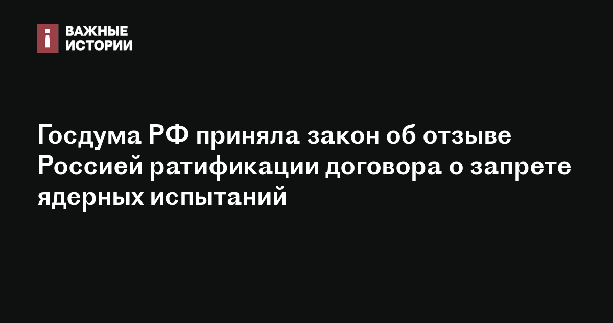 Госдума РФ приняла закон об отзыве Россией ратификации договора о запрете ядерных испытаний, следует из трансляции на сайте парламента.